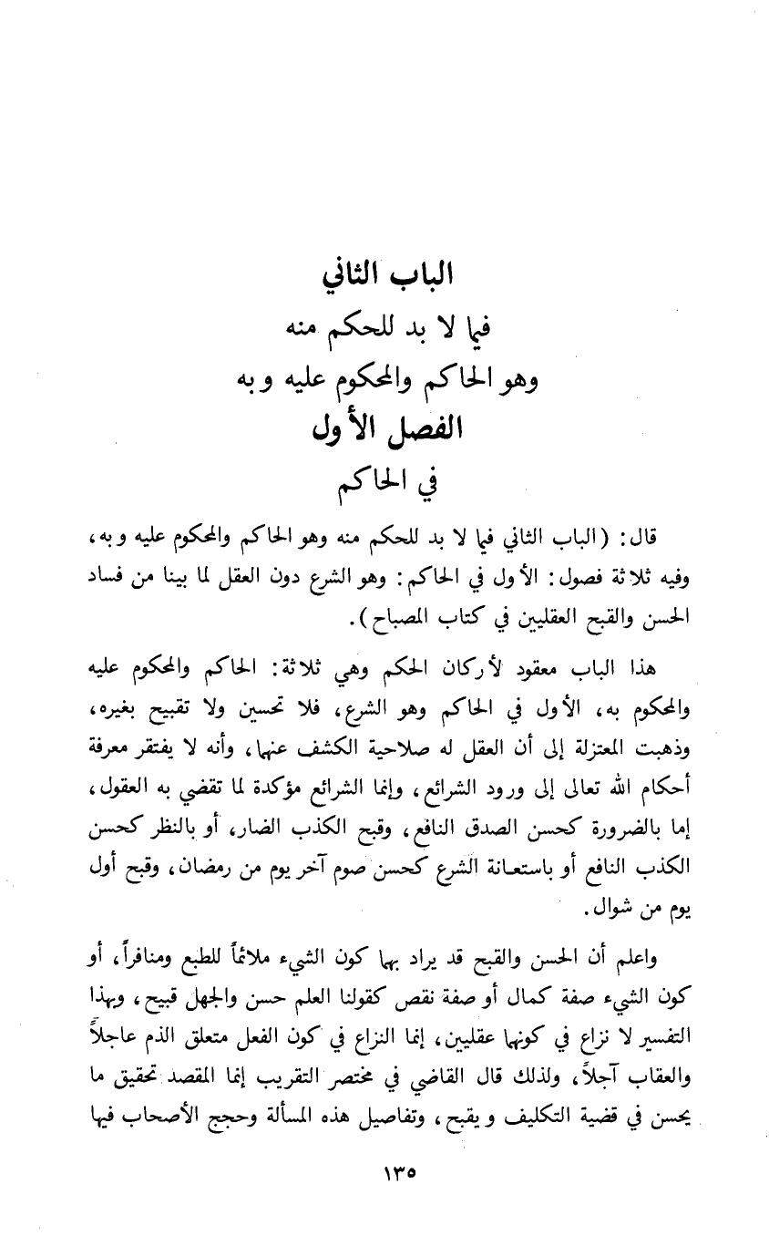 هذا الباب معقود لأركان الحكم وهي ثلاثة الحاكم والمحكوم عليه والمحكوم به الأول في الحاكم وهو الشرع فلا تحسين ولا تقبيح بغيره وذهبت المعتزلة إلى أن العقل له صلاحية الكشف عنهما وأنه لا يفتقر معرفة أحكام الله تعالى إلى ورود الشرائع وإنما الشرائع مؤكدة لما تقضي به العقول إما بالضرورة كحسن الصدق النافع وقبح الكذب الضار أو بالنظر كحسن الكذب النافع أو باستعانة الشرع كحسن صوم آخر يوم من رمضان وقبح أول يوم من شوال.