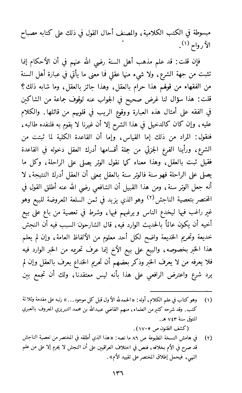 فإن قلت قد علم مذهب أهل السنة رضي الله عنهم في أن الأحكام إنما تثبت من جهة الشرع ولا شيء منها عقلي فما معنى ما يأتي في عبارة أهل السنة من الفقهاء من قولهم هذا حرام بالعقل وهذا جائز بالعقل وما شابه ذلك قلت هذا سؤال لنا غرض صحيح في الجواب عنه لوقوف جماعة من الشاكين في الفقه على أمثال هذه العبارة ووقوع الريب في قلوبهم من قائلها والكلام عليه وإن كان كالدخيل في هذا الشرح إلا أن غيرنا لا يقوم به فلنفده طالبه فنقول المراد من ذلك إما القياس وإما أن القاعدة الكلية لما ثبتت من الشرع ورأينا الفرع الجزئي من جملة أقسامها أدرك العقل دخوله في القاعدة فقيل ثبت بالعقل وهذا معناه كما نقول الوتر يصلى على الراحلة وكل ما يصلى على الراحلة فهو سنة فالوتر سنة بالعقل بمعنى أن العقل أدرك النتيجة لا أنه جعل الوتر سنة ومن هذا القبيل أن الشافعي رضي الله عنه أطلق القول في المختصر بتعصية الناجش2 وهو الذي يزيد في ثمن السلعة المعروضة للبيع وهو غير راغب فيها ليخدع الناس ويرغبهم فيها وشرط في تعصية من باع على بيع أخيه أن يكون عالما بالحديث الوارد فيه قال الشارحون السبب فيه أن النجش خديعة وتحريم الخديعة واضح لكل أحد معلوم من الألفاظ العامة وإن لم يعلم هذا الخبر بخصوصه والبيع على بيع الأخ إنما عرف تحريمه من الخبر الوارد فيه فلا يعرفه من لا يعرف الخبر وذكر بعضهم أن تحريم الخداع يعرف بالعقل وإن لم يرد الشرع واعترض الرافعي على هذا بأنه ليس معتقدنا ولك أن تجمع بين