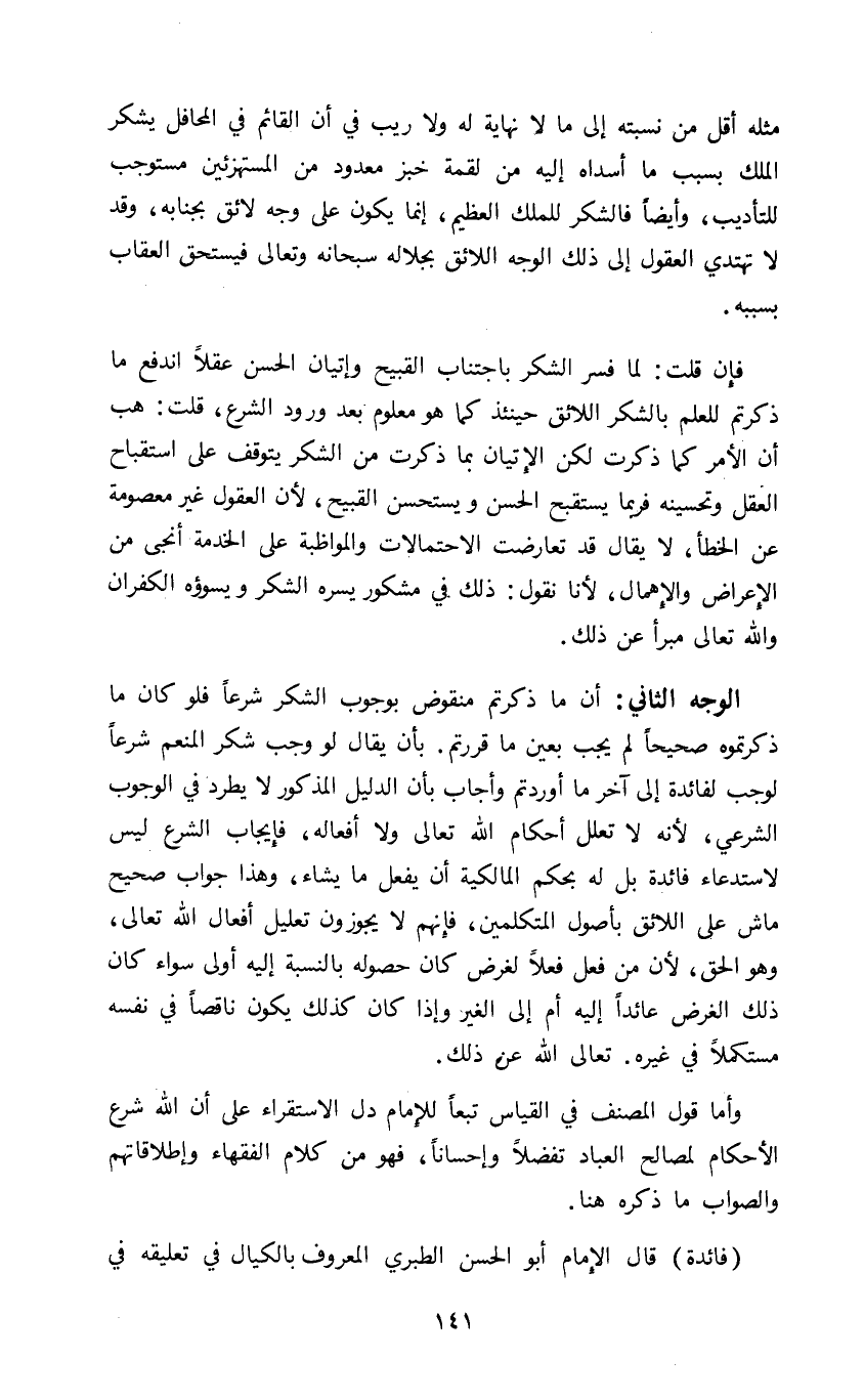 الوجه الثاني: أن ما ذكرتم منقوض بوجوب الشكر شرعا فلو كان ما ذكرتموه صحيحا لم يجب بعين ما قررتم بأن يقال لو وجب شكر المنعم شرعا لوجب لفائدة إلى آخر ما أوردتم وأجاب بأن الدليل المذكور لا يطرد في الوجوب الشرعي لأنه لا تعلل أحكام الله تعالى ولا أفعاله فإيجاب الشرع ليس لاستدعاء فائدة بل له بحكم المالكية أن يفعل ما يشاء وهذا جواب صحيح ماش على اللائق بأصول المتكلمين فإنهم لا يجوزون تعليل أفعال الله تعالى وهو الحق لأن من فعل فعلا لغرض كان حصوله بالنسبة إليه أولى سواء كان ذلك لغرض عائدا إليه أم إلى الغير وإذا كان كذلك يكون ناقصا في نفسه مستكملا في غيره تعالى الله عن ذلك.