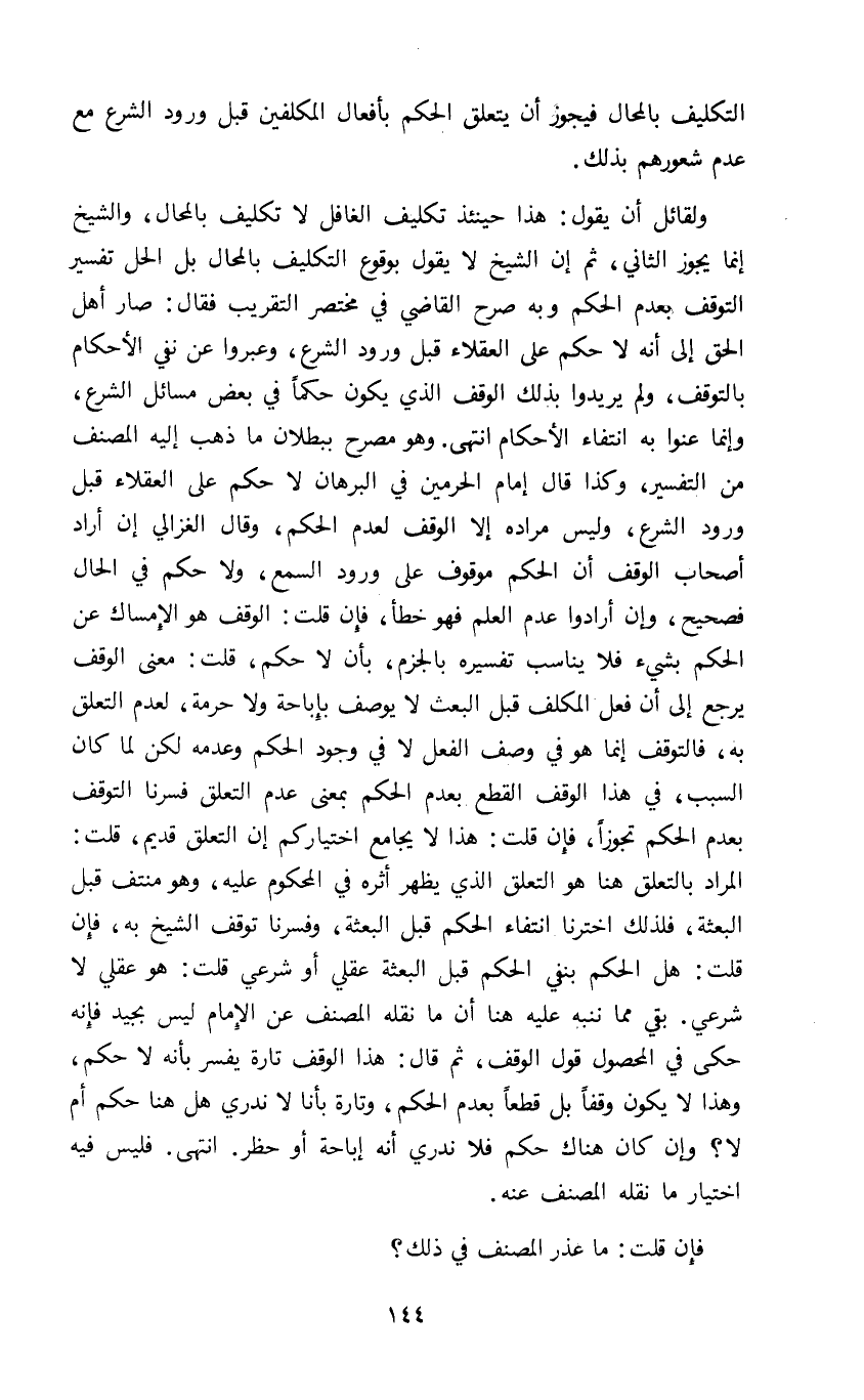 ولقائل أن يقول هذا حينئذ تكليف الغافل لا تكليف بالمحال والشيخ إنما يجوز الثاني ثم إن الشيخ لا يقول بوقوع التكليف بالمحال بل الحل تفسير التوقف بعدم الحكم وبه صرح القاضي في مختصر التقريب فقال صار أهل الحق إلى أنه لا حكم على العقلاء قبل ورود الشرع وعبروا عن نفي الأحكام بالتوقف ولم يريدوا بذلك الوقف الذي يكون حكما في بعض مسائل الشرع وإنما عنوا به انتفاء الأحكام انتهى وهو مصرح ببطلان ما ذهب إليه المصنف من التفسير وكذا قال إمام الحرمين في البرهان لا حكم على العقلاء قبل ورود الشرع وليس مراده إلا الوقف لعدم الحكم وقال الغزالي إن أراد أصحاب الوقف أن الحكم موقوف على ورود السمع ولا حكم في الحال فصحيح وإن أرادوا عدم العلم فهو خطأ فإن قلت الوقف هو الإمساك عن الحكم بشيء فلا يناسب تفسيره بالجزم بأن لا حكم قلت معنى الوقف يرجع إلى أن فعل المكلف قبل البعث لا يوصف بإباحة ولا حرمة لعدم التعلق به فالتوقف إنما هو في وصف الفعل لا في وجود الحكم وعدمه لكن لما كان السبب في هذا الوقف بعدم الحكم بمعنى عدم التعلق فسرنا التوقف بعدم الحكم تجوزا فإن قلت هذا لا يجامع اختياركم إن التعلق قديم قلت المراد بالتعلق هنا هو التعلق الذي يظهر أثره في المحكوم عليه وهو منتف قبل البعثة فلذلك اخترنا انتفاء الحكم قبل البعثة وفسرنا توقف الشيخ به فإن قلت هل الحكم بنفي الحكم قبل البعثة عقلي أو شرعي قلت هو عقلي لا شرعي بقي مما ننبه عليه هنا أن ما نقله المصنف عن الإمام ليس بجيد فإنه حكى في المحصول قول الوقف ثم قال هذا الوقف تارة يفسر بأنه لا حكم وهذا لا يكون وقفا بل قطعا بعدم الحكم وتارة بأنا لا ندري هل هنا حكم أم لا وإن كان هناك حكم فلا ندري أنه إباحة أو حظر انتهى فليس فيه اختيار ما نقله المصنف عنه.