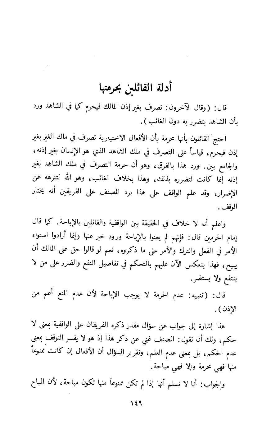 احتج القائلون بأنها محرمة بأن الأفعال الاختيارية تصرف في ملك الغير بغير إذن فيحرم قياسا على التصرف في ملك الشاهد الذي هو الإنسان بغير إذنه والجامع بين ورد هذا بالفرق وهو أن حرمة التصرف في ملك الشاهد بغير إذنه إنما كانت لتضرره بذلك وهذا بخلاف الغائب وهو الله لتنزهه عن الإضرار وقد علم الواقف على هذا برد المصنف على الفريقين أنه يختار الوقف.