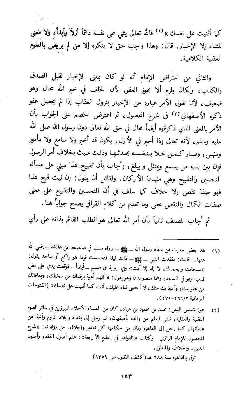 والثاني: من اعتراض الإمام أنه لو كان بمعنى الإخبار لقبل الصدق والكذب ولكن يلزم ألا يجوز العفو لأن الخلف في خبر الله محال وهو ضعيف لأنا نقول الأمر عبارة عن الإخبار بنزول العقاب إذا لم يحصل عفو ذكره الأصفهاني2 في شرح المحصول ثم اعترض الخصم على الجواب بأن الأمر بالمعنى الذي ذكرتموه أيضا محال في حق الله تعالى دون رسول الله صلى الله عليه وسلم لأنه تعالى إذا أخبر في الأزل يكون قد أخبر ولا سامع ولا مأمور ومنهى وصار كمن خلا بنفسه يحدثها وذلك عبث بخلاف أمر الرسول فإن بين يديه من يسمع ويمتثل ويبلغ وأجاب بأن تقبيح هذا مبني على مسأله التحسين والتقبيح وهي منهدمة الأركان ولقائل أن يقول إن ثبت قبح هذا فهو صفة نقص ولا خلاف كما سلف في أن التحسين والتقبيح على معنى صفات الكمال والنقص عقلي وما تقدم من كلام القرافي يصلح جوابا هنا.