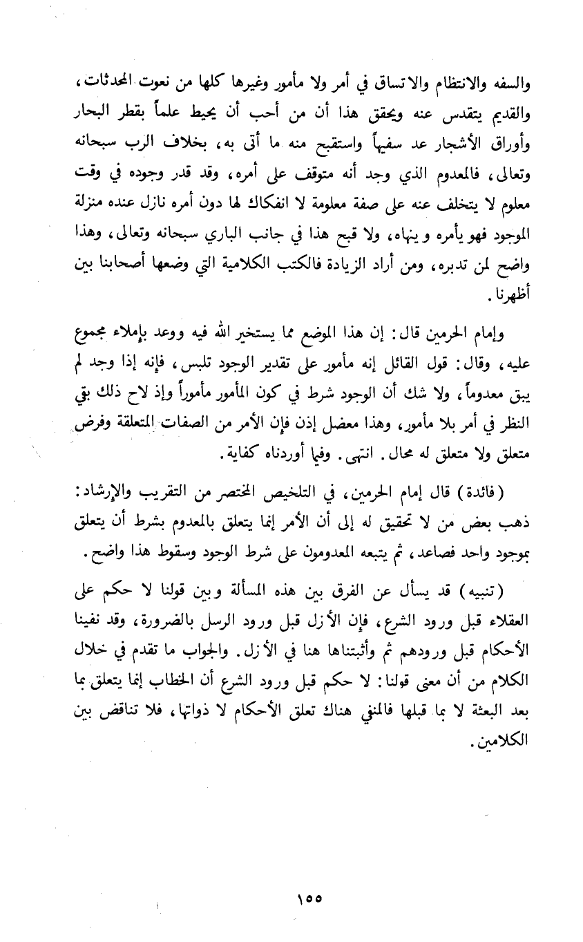 والسفه والانتظام والاتساق في أمر ولا مأمور وغيرها كلها من نعوت المحثات والقديم يتقدس عنه ويحقق هذا أن من أحب أن يحيط علما بقطر البحار وأوراق الأشجار عد سفيها واستقبح منه ما أتى به بخلاف الرب سبحانه وتعالى فالمعدوم الذي وجد أنه متوقف على أمره وقد قدر وجوده في وقت معلوم لا يتخلف عنه على صفة معلومة لا انفكاك لها دون أمره نازل عنده منزلة الموجود فهو يأمره وينهاه ولا قبح هذا في جانب الباري سبحانه وتعالى وهذا واضح لمن تدبره ومن أراد الزيادة فالكتب الكلامية التي وضعها أصحابنا بين أظهرنا.