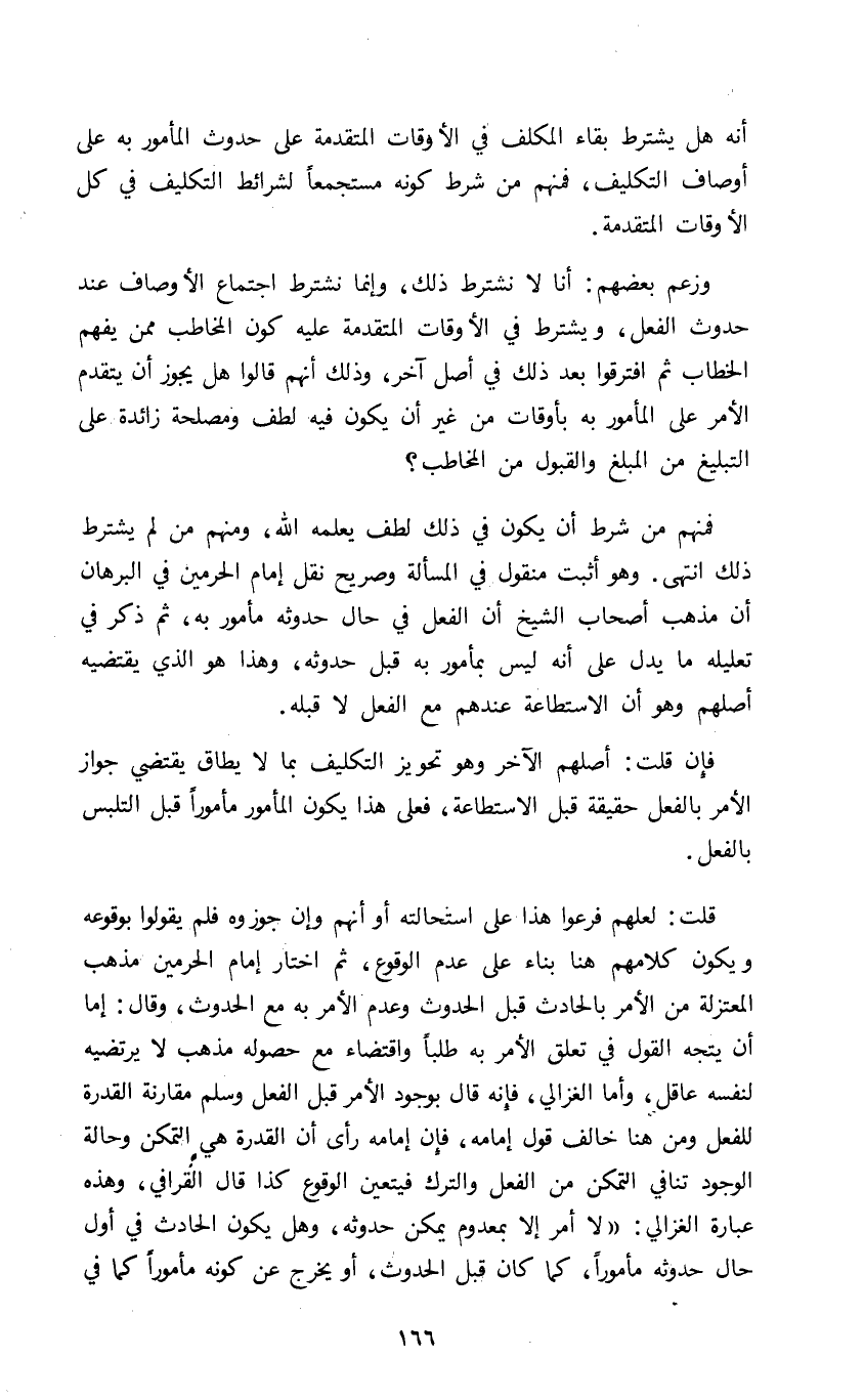 فمنهم من شرط أن يكون في ذلك لطف يعلمه الله ومنهم من لم يشترط ذلك انتهى وهو أثبت منقول في المسألة وصريح نقل إمام الحرمين في البرهان أن مذهب أصحاب الشيخ أن الفعل في حال حدوثه مأمور به ثم ذكر في تعليله ما يدل على أنه ليس بمأمور به قبل حدوثه وهذا هو الذي يقتضيه أصلهم وهو أن الاستطاعة عندهم مع الفعل لا قبله.