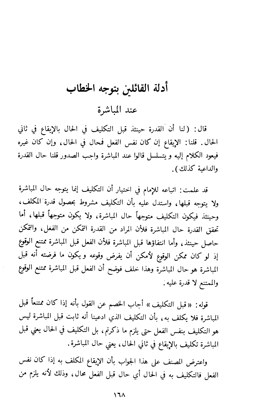 قال لنا أن القدرة حينئذ قبل التكليف في الحال بالإيقاع في ثاني الحال قلنا الإيقاع إن كان نفس الفعل فمحال في الحال وإن كان غيره فيعود الكلام إليه ويتسلسل قالوا عند المباشرة واجب الصدور قلنا حال القدرة والداعية كذلك.