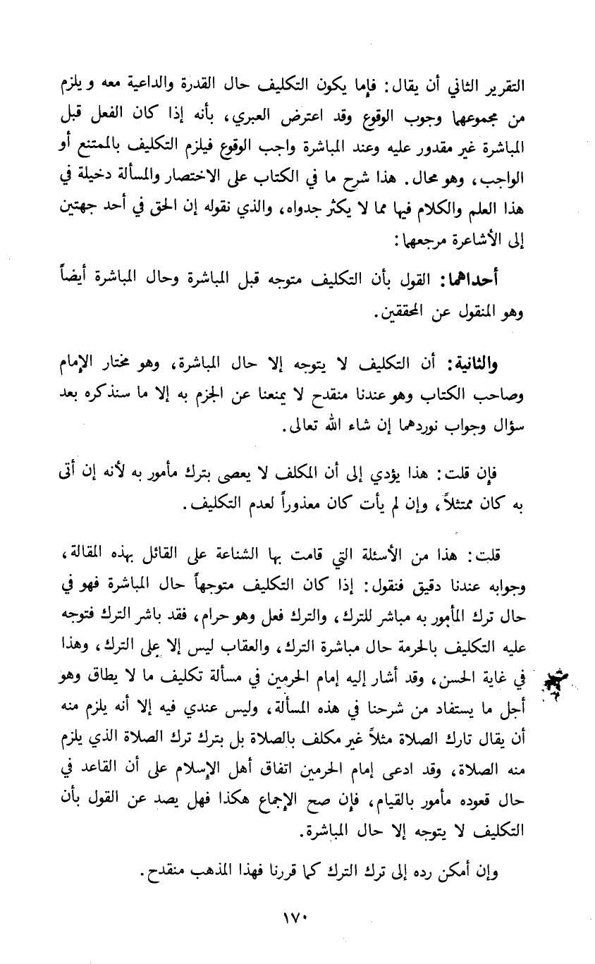 قلت هذا من الأسئلة التي قامت بها الشناعة على القائل بهذه المقالة وجوابه عندنا دقيق فنقول إذا كان التكليف متوجها حال المباشرة فهو في حال ترك المأمور به مباشر للترك والترك فعل وهو حرام فقد باشر الترك فتوجه عليه التكليف بالحرمة حال مباشرة الترك والعقاب ليس إلا على الترك وهذا في غاية الحسن وقد أشار إليه إمام الحرمين في مسألة تكليف ما لا يطاق وهو أجل ما يستفاد من شرحنا في هذه المسألة وليس عندي فيه إلا أنه يلزم منه أن يقال تارك الصلاة مثلا غير مكلف بالصلاة بترك ترك الصلاة الذي يلزم منه الصلاة وقد ادعى إمام الحرمين اتفاق أهل الإسلام على أن القاعد في حال قعوده مأمور بالقيام فإن صح الإجماع هكذا فهل يصد عن القول بأن التكليف لا يتوجه إلا حال المباشرة.