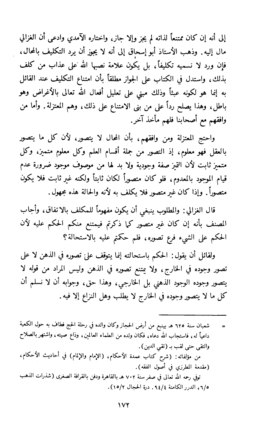 قال الغزالي والمطلوب ينبغي أن يكون مفهوما للمكلف بالاتفاق وأجاب المصنف بأنه إن كان غير متصور كما ذكرتم فيمتنع منكم الحكم عليه لأن الحكم على الشيء فرع تصوره فلم حكمتم عليه بالاستحالة؟