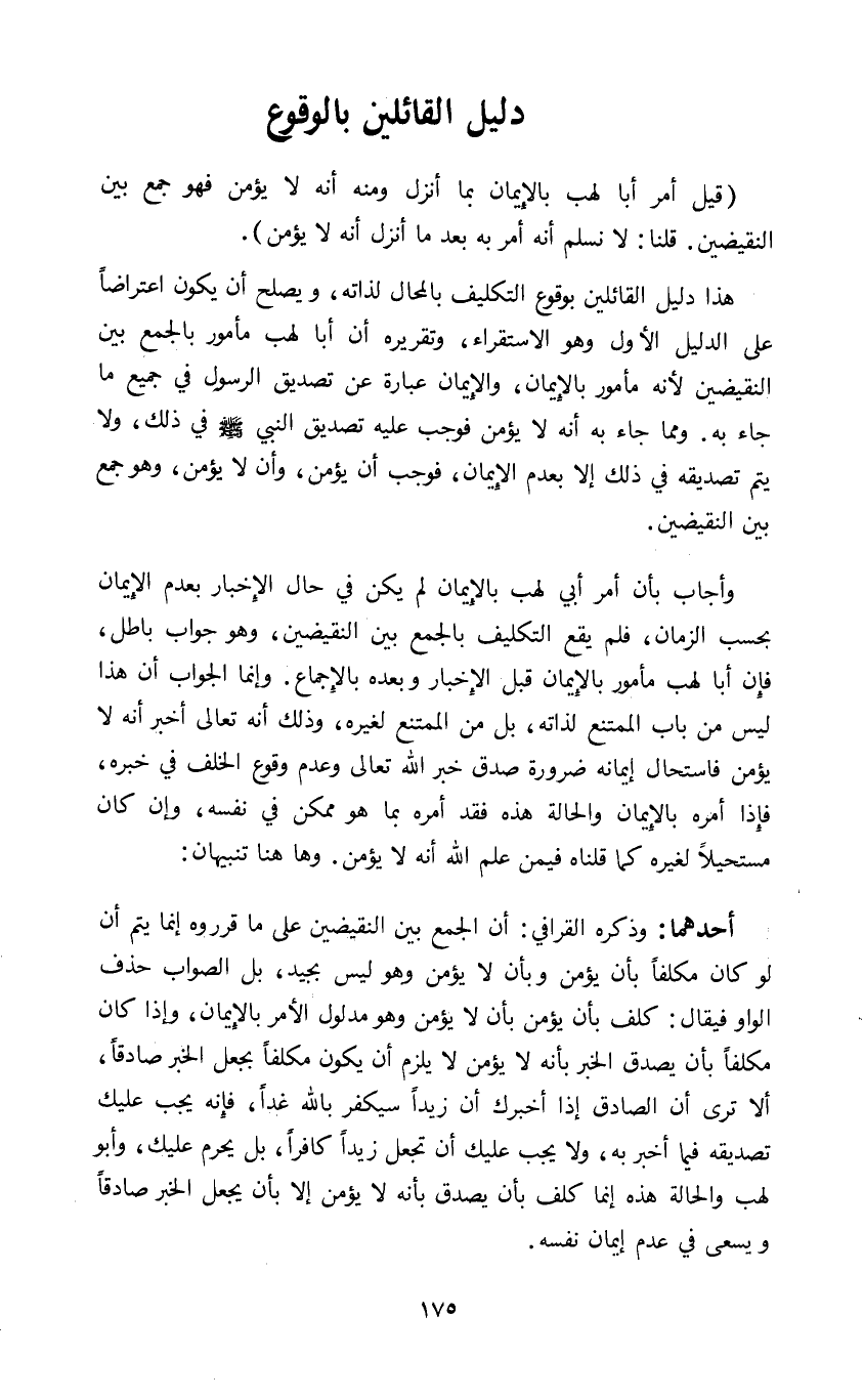 أحدهما: وذكره القرافي أن الجمع بين النقيضين على ما قرروه إنما يتم أن لو كان مكلفا بأن يؤمن وبأن لا يؤمن وهو ليس بجيد بل الصواب حذف الواو فيقال كلف بأن يؤمن بأن لا يؤمن وهو مدلول الأمر بالإيمان وإذا كان مكلفا بأن يصدق الخبر بأنه لا يؤمن لا يلزم أن يكون مكلفا بجعل الخبر صادقا ألا ترى أن الصادق إذا أخبرك أن زيدا سيكفر بالله غذا فإنه يجب عليك تصديقه فيما أخبر به ولا يجب عليك أن تجعل زيدا كافرا بل يحرم عليك وأبو لهب والحالة هذه إنما كلف بأن يصدق بأنه لا يؤمن إلا بأن يجعل الخبر صادقا ويسعى في عدم إيمان نفسه.