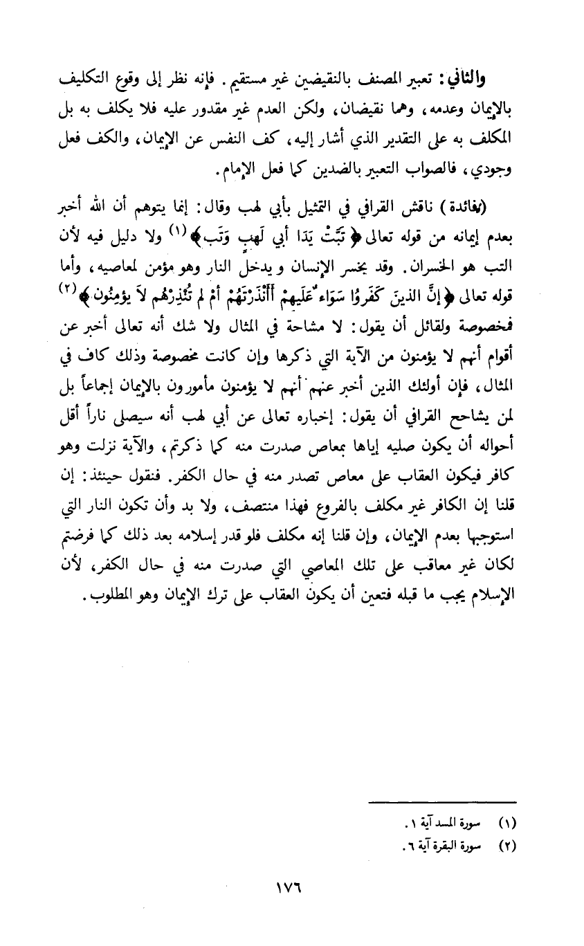 فائدة ناقش القرافي في التمثيل بأبي لهب وقال إنما يتوهم أن الله أخبر بعدم إيمانه من قوله تعالى: {تَبَّتْ يَدَا أَبِي لَهَبٍ وَتَبَّ} 1 ولا دليل فيه لأن التب هو الخسران وقد يخسر الإنسان ويدخل النار وهو مؤمن لمعاصيه وأما قوله تعالى: {إِنَّ الَّذِينَ كَفَرُوا سَوَاءٌ عَلَيْهِمْ أَأَنْذَرْتَهُمْ أَمْ لَمْ تُنْذِرْهُمْ لا يُؤْمِنُونَ} 2 فمخصوصة ولقائل أن يقول لا مشاحة في المثال ولا شك أنه تعالى أخبر عن أقوام أنهم لا يؤمنون من الآية التي ذكرها وإن كانت مخصوصة وذلك كاف في المثال فإن أولئك الذين أخبر عنهم أنهم لا يؤمنون مأمورون بالإيمان إجماعا بل لمن يشاحح القرافي أن يقول إخباره تعالى عن أبي لهب أنه سيصلى نارا أقل أحواله أن يكون صليه إياها بمعاص صدرت منه كما ذكرتم والآية نزلت وهو كافر فيكون العقاب على معاص تصدر منه في حال الكفر فنقول حينئذ إن قلنا إن الكافر غير مكلف بالفروع فهذا منتصف ولا بد أن تكون النار التي استوجبها بعدم الإيمان وإن قلنا أنه مكلف فلو قدر إسلامه بعد ذلك كما فرضتم لكان غير معاقب على تلك المعاصي التي صدرت منه في حال الكفر لأن الإسلام يجب ما قبله فتعين أن يكون العقاب على ترك الإيمان وهو المطلوب.