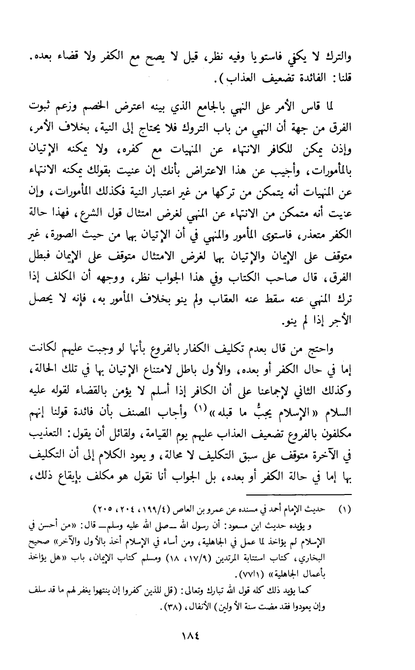 واحتج من قال بعدم تكليف الكفار بالفروع بأنها لو وجبت عليهم لكانت إما في حال الكفر أو بعده والأول باطل لامتناع الإتيان بها في تلك الحالة وكذلك الثاني لإجماعنا على أن الكافر إذا أسلم لا يؤمن بالقضاء لقوله عليه السلام: "الإسلام يجب ما قبله" 1 وأجاب المصنف بأن فائدة قولنا إنهم مكلفون بالفروع تضعيف العذاب عليهم يوم القيامة ولقائل أن يقول التعذيب في الآخرة متوقف على سبق التكليف لا محالة ويعود الكلام إلى أن التكليف بها إما في حالة الكفر أو بعده بل الجواب أنا نقول هو مكلف بإيقاع ذلك.