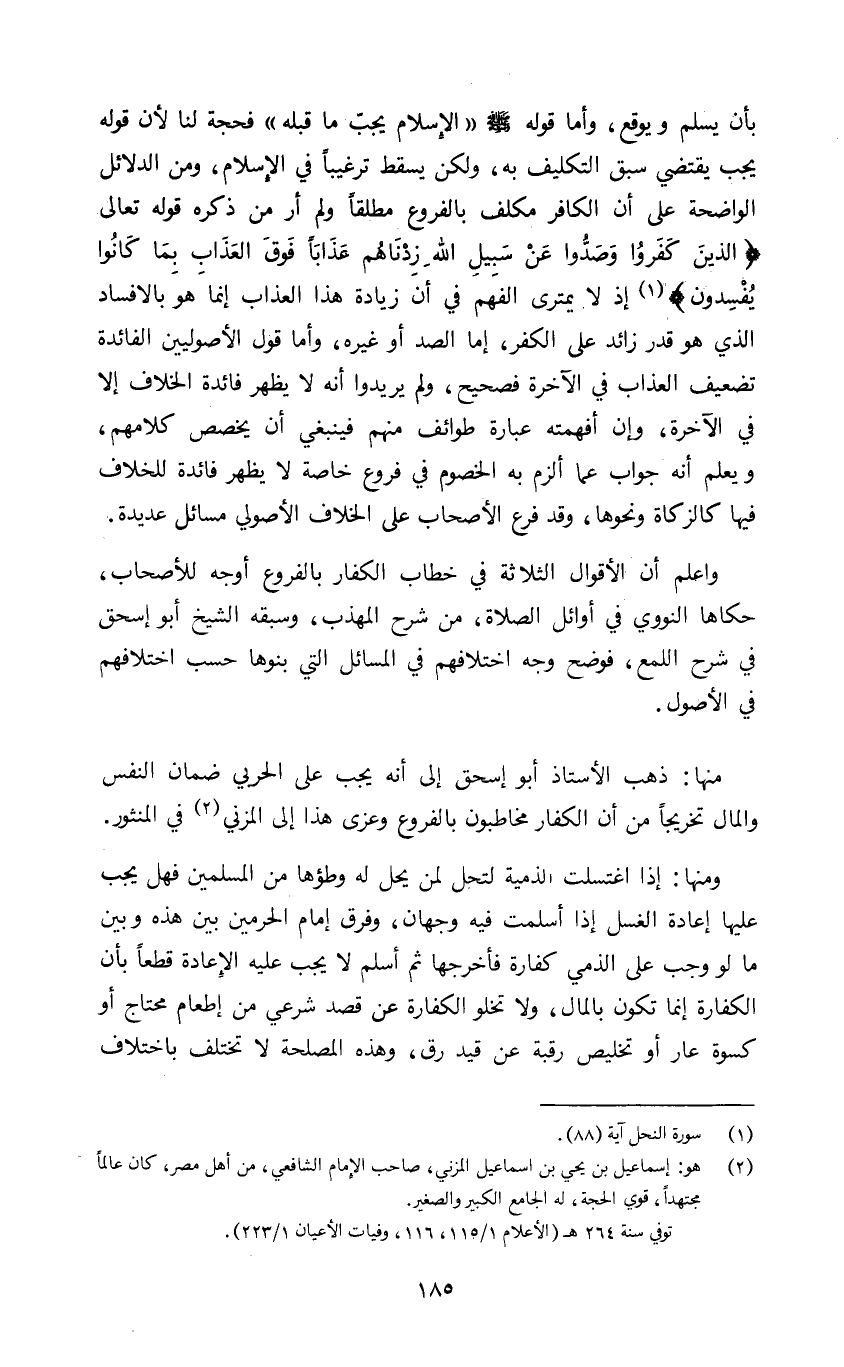 بأن يسلم ويوقع وأما قوله صلى الله عليه وسلم: "الإسلام يجب ما قبله" فحجة لنا لأن قوله يجب يقتضي سبق التكليف به ولكن يسقط ترغيبا في الإسلام ومن الدلائل الواضحة على أن الكافر مكلف بالفروع مطلقا ولم أر من ذكره قوله تعالى: {الَّذِينَ كَفَرُوا وَصَدُّوا عَنْ سَبِيلِ اللَّهِ زِدْنَاهُمْ عَذَاباً فَوْقَ الْعَذَابِ بِمَا كَانُوا يُفْسِدُونَ} 1 إذ لا يمترى الفهم في أن زيادة هذا العذاب إنما هو بالافساد الذي هو قدر زائد على الكفر إما الصد أو غيره وأما قول الأصوليين الفائدة تضعيف العذاب في الآخرة فصحيح ولم يريدوا أنه لا يظهر فائدة الخلاف إلا في الآخرة وإن أفهمته عبارة طوائف منهم فينبغي أن يخصص كلامهم ويعلم أنه جواب عما ألزم به الخصوم في فروع خاصة لا يظهر فيها فائدة للخلاف فيها كالزكاة ونحوها وقد فرع الأصحاب على الخلاف الأصولي مسائل عديدة.