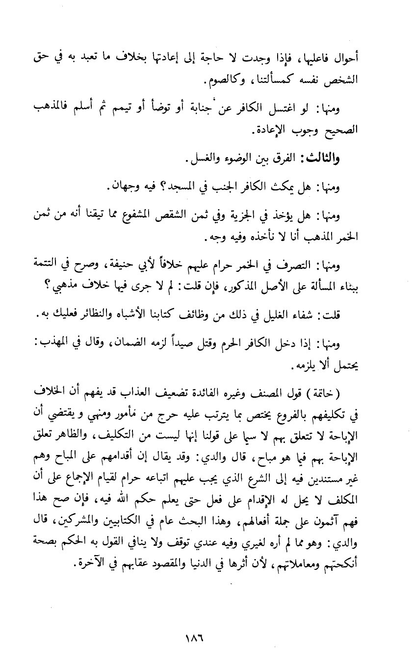 خاتمة قول المصنف وغيره الفائدة تضعيف العذاب قد يفهم أن الخلاف في تكليفهم بالفروع يختص بما يترتب عليه حرج من مأمور ومنهي ويقتضي أن الإباحة لا تتعلق بهم لاسيما على قولنا إنها ليست من التكليف والظاهر تعلق الإباحة بهم فيما هو مباح قال والدي وقد يقال إن أقدامهم على المباح وهم غير مستندين فيه إلى الشرع الذي يجب عليهم اتباعه حرام لقيام الإجماع على أن المكلف لا يحل له الإقدام على فعل حتى يعلم حكم الله فيه فإن صح هذا فهم آثمون على جملة أفعالهم وهذا البحث عام في الكتابيين والمشركين قال والدي وهو مما لم أره لغيري وفيه عندي توقف ولا ينافي القول به الحكم بصحة أنكحتهم ومعاملاتهم لأن أثرها في الدنيا والمقصود عقابهم في الآخرة.