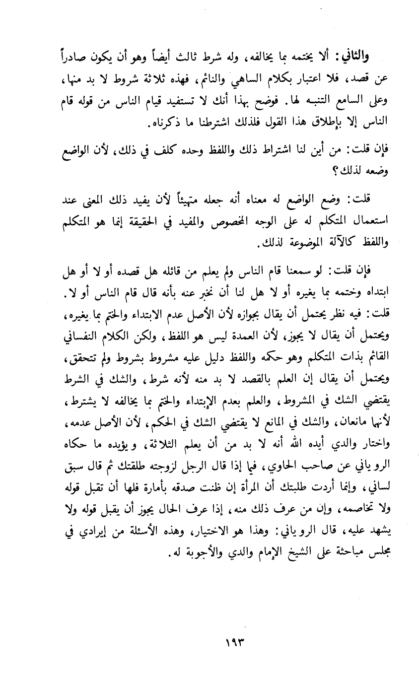 فإن قلت لو سمعنا قام الناس ولم يعلم من قائله هل قصده أو لا أو ابتداه وختمه بما يغيره أو لا هل لنا أن نخبر عنه بأنه قال قام الناس أو لا قلت فيه نظر يحتمل أن يقال بجوازه لأن الأصل عدم الابتداء والختم بما يغيره ويحتمل أن يقال لا يجوز لأن العمدة ليس هو اللفظ ولكن الكلام النفساني القائم بذات المتكلم وهو حكمه واللفظ دليل عليه مشروط بشروط ولم تتحقق ويحتمل أن يقال إن العلم بالقصد لا بد منه لأنه شرط والشك في الشرط يقتضي الشك في المشروط والعلم بعدم الإبتداء والختم بما يخالفه لا يشترط لأنهما مانعان والشك في المانع لا يقتضي الشك في الحكم لأن الأصل عدمه واختار والدي أيده الله أنه لا بد من أن يعلم الثلاثة ويؤيده ما حكاه الروياني عن صاحب الحاوي فيما إذا قال الرجل لزوجته طلقتك ثم قال سبق لساني وإنما أردت طلبتك أن المرأة إن ظنت صدقه بأمارة فلها أن تقبل قوله ولا تخاصمه وإن من عرف ذلك منه إذا عرف الحال يجوز أن يقبل قوله ولا يشهد عليه قال الروياني وهذا هو الاختيار وهذه الأسئلة من إيرادي في مجلس مباحثة على الشيخ الإمام والدي والأجوبة له.