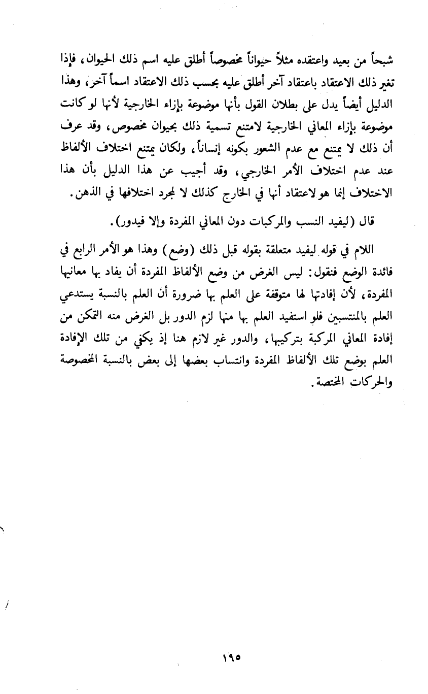 شبحا من بعيد واعتقده مثلا حيوانا مخصوصا أطلق عليه اسم ذلك الحيوان فإذا تغير ذلك الاعتقاد باعتقاد آخر أطلق عليه بحسب ذلك الاعتقاد اسما آخر وهذا الدليل أيضا يدل على بطلان القول بأنها موضوعة بإزاء الخارجية لأنها لو كانت موضوعة بإزاء المعاني الخارجية لامتنع تسمية ذلك بحيوان مخصوص وقد عرف أن ذلك لا يمتنع مع عدم الشعور بكونه إنسانا ولكان يمتنع اختلاف الألفاظ عند عدم اختلاف الأمر الخارجي وقد أجيب عن هذا الدليل بأن هذا الاختلاف إنما هو لاعتقاد أنها في الخارج كذلك لا لمجرد اختلافها في الذهن.