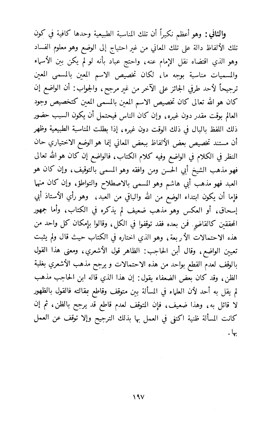 والثاني: وهو أعظم نكيرا أن تلك المناسبة الطبيعية وحدها كافية في كون تلك الألفاظ دالة على تلك المعاني من غير احتياج إلى الوضع وهو معلوم الفساد هو الذي اقتضاه نقل الإمام عنه واحتج عباد بأنه لو لم يكن بين الأسماء والمسميات مناسبة بوجه ما لكان تخصيص الاسم المعين بالمسمى المعين ترجيحا لأحد طرفي الجائز على الآخر من غير مرجح والجواب أن الواضع إن كان هو الله تعالى كان تخصيص الاسم المعين بالمسمى المعين كتخصيص وجود العالم بوقت مقدر دون غيره وإن كان الناس فيحتمل أن يكون السبب حضور ذلك اللفظ بالبال في ذلك الوقت دون غيره إذا بطلت المناسبة الطبيعية وظهر أن مستند تخصيص بعض الألفاظ ببعض المعاني إنما هو الوضع الاختياري حان النظر في الكلام في الواضع وفيه كلام الكتاب فالواضع إن كان هو الله تعالى فهو مذهب الشيخ أبي الحسن ومن وافقه وهو المسمى بالتوقيف وإن كان هو العبد فهو مذهب الشيخ أبي هاشم وهو المسمى بالاصطلاح والتواطؤ وإن كان منهما فإما أن يكون ابتداء الوضع من الله والباقي من العبد وهو رأي الأستاذ أبي إسحاق أو العكس وهو مذهب ضعيف لم يذكره في الكتاب وأما جمهور المحققين كالقاضي فمن بعده فقد توقفوا في الكل وقالوا بإمكان كل واحد من هذه الاحتمالات الأربعة وهو الذي اختاره في الكتاب حيث قال ولم يثبت تعيين الواضع وقال ابن الحاجب الظاهر قول الأشعري ومعنى هذا القول بالوقف لعدم القطع بواحد من هذه الاحتمالات ويرجح مذهب الأشعري بغلبة الظن وقد كان بعض الضعفاء يقول إن هذا الذي قاله ابن الحاجب مذهب لم يقل به أحد لأن العلماء في المسألة بين متوقف وقاطع بمقالته فالقول بالظهور لا قائل به وهذا ضعيف فإن المتوقف لعدم قاطع قد يرجح بالظن ثم إن كانت المسألة ظنية اكتفى في العمل بها لذلك الترجيح وإلا توقف عن العمل بها.