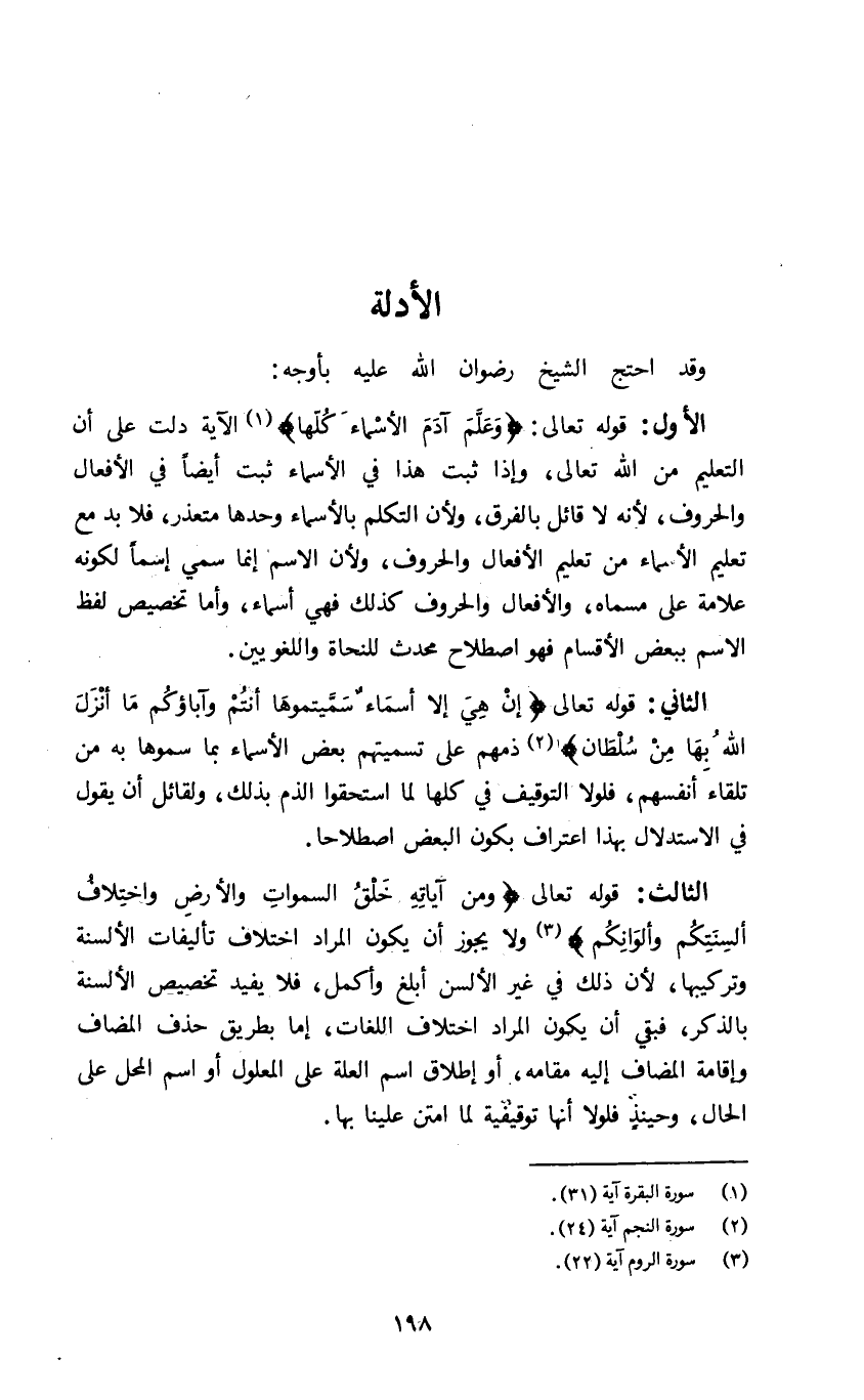 الثالث قوله تعالى: {وَمِنْ آيَاتِهِ خَلْقُ السَّمَاوَاتِ وَالْأَرْضِ وَاخْتِلافُ أَلْسِنَتِكُمْ وَأَلْوَانِكُمْ} 3 ولا يجوز أن يكون المراد اختلاف تأليفات الألسنة وتركيبها لأن ذلك في غيرالألسن أبلغ وأكمل فلا يفيد تخصيص الألسنة بالذكر فبقي أن يكون المراد اختلاف اللغات إما بطريق حذف المضاف وإقامة المضاف إليه مقامه أو إطلاق اسم العلة على المعلول أو اسم المحل على الحال وحينئذ فلولا أنها توقيفية لما امتن علينا بها.