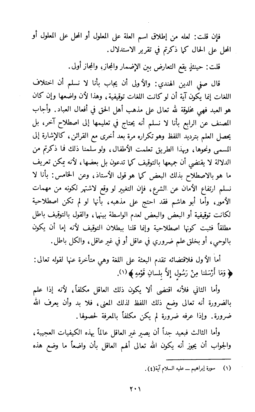 قال صفي الدين الهندي والأولى أن يجاب بأنا لا نسلم أن اختلاف اللغات إنما يكون آية أن لو كانت اللغات توقيفية وهذا لأن واضعها وإن كان هو العبد فهي مخلوقة لله تعالى على مذهب أهل الحق في أفعال العباد وأجاب المصنف عن الرابع بأنا لا نسلم أنه يحتاج في تعليمها إلى اصطلاح آخر بل يحصل العلم بترديد اللفظ وهو تكراره مرة أخرى مع القرائن كالإشارة إلى المسمى ونحوها وبهذا الطريق تعلمت الأطفال ولو سلمنا ذلك فما ذكرتم من الدلالة لا يقتضي أن جميعها بالتوقيف كما تدعون بل بعضها لأنه يمكن تعريف ما هو بالاصطلاح بذلك البعض كما هو قول الأستاذ وعن الخامس بأنا لا نسلم ارتفاع الأمان عن الشرع فإن التغيير لو وقع لاشتهر لكونه من مهمات الأمور وأما أبو هاشم فقد احتج على مذهبه بأنها لو لم تكن اصطلاحية لكانت توقيفية أو البعض والبعض لعدم الواسطة بينهما والقول بالتوقيف باطل مطلقا فثبت كونها اصطلاحية وإنما قلنا ببطلان التوقيف لأنه إما أن يكون بالوحي أو بخلق علم ضروري في عاقل أو في غير عاقل والكل باطل.