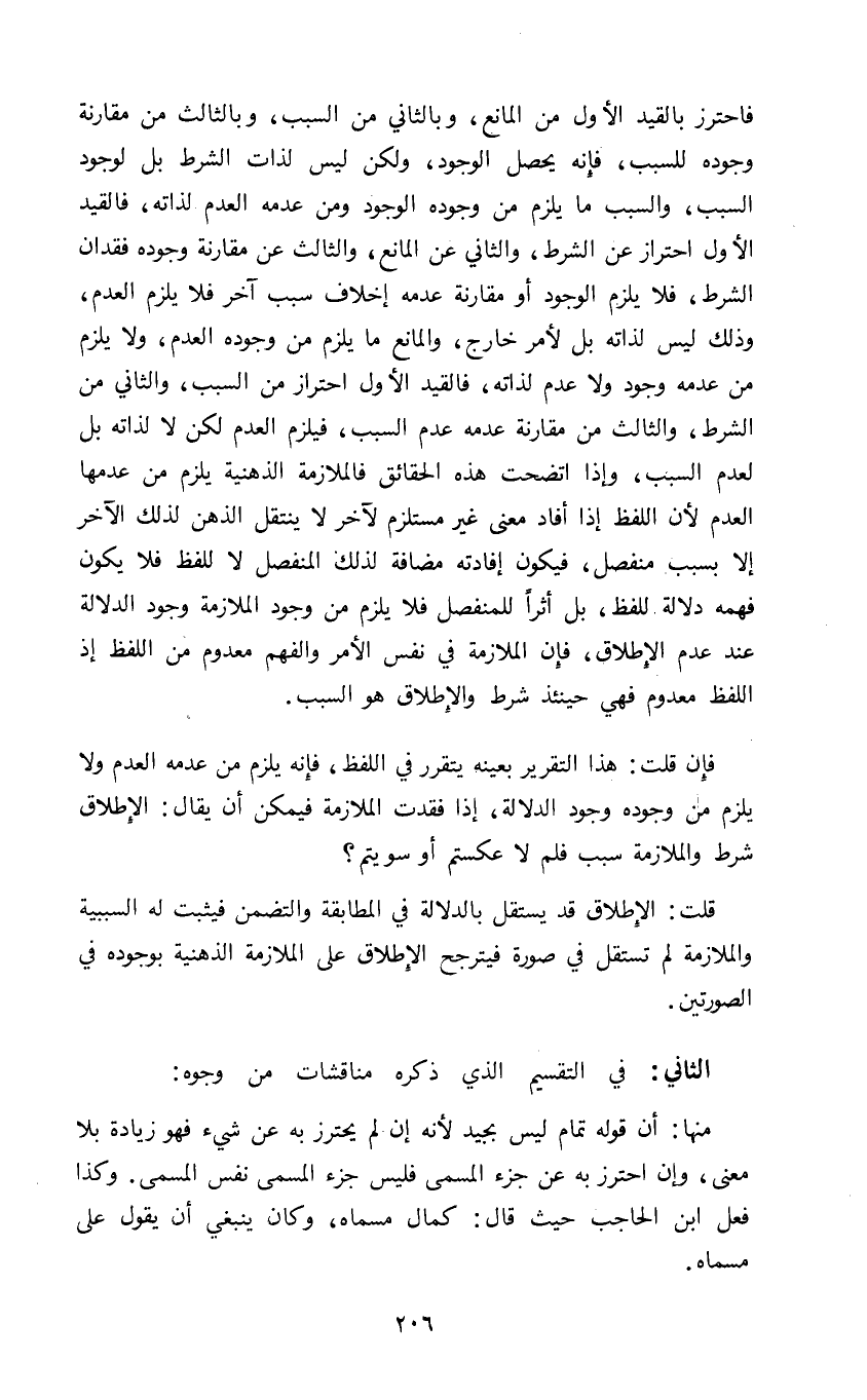 فاحترز بالقيد الأول من المانع وبالثاني من السبب وبالثالث من مقارنة وجوده للسبب فإنه يحصل الوجود ولكن ليس لذات الشرط بل لوجود السبب والسبب ما يلزم من وجوده الوجود ومن عدمه العدم لذاته فالقيد الأول احتراز عن الشرط والثاني عن المانع والثالث عن مقارنة وجوده فقدان الشرط فلا يلزم الوجود أو مقارنة عدمه إخلاف سبب آخر فلا يلزم العدم وذلك ليس لذاته بل لأمر خارج والمانع ما يلزم من وجوده العدم ولا يلزم من عدمه وجود ولا عدم لذاته فالقيد الأول احتراز من السبب والثاني من الشرط والثالث من مقارنة عدمه عدم السبب فيلزم العدم لكن لا لذاته بل لعدم السبب وإذا اتضحت هذه الحقائق فالملازمة الذهنية يلزم من عدمها العدم لأن اللفظ إذا أفاد معنى غير مستلزم لآخر لا ينتقل الذهن لذلك الآخر إلا بسبب منفصل فيكون إفادته مضافة لذلك المنفصل لا للفظ فلا يكون فهمه دلالة للفظ بل أثرا للمنفصل فلا يلزم من وجود الملازمة وجود الدلالة عند عدم الإطلاق فإن الملازمة في نفس الأمر والفهم معدوم من اللفظ إذ اللفظ معدوم فهي حينئذ شرط والإطلاق هو السبب.