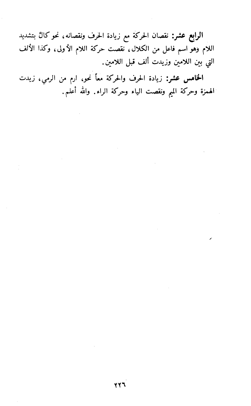 الخامس عشر: زيادة الحرف والحركة معا نحو ارم من الرمي زيدت الهمزة وحركة الميم ونقصت الياء وحركة الراء والله أعلم.
