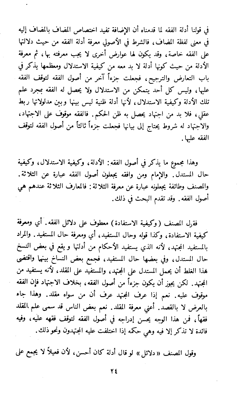 في قولنا أدلة الفقه لما قدمناه أن الإضافة تفيد اختصاص المضاف بالمضاف إليه في معنى لفظة المضاف فالشرط في الأصولي معرفة أدلة الفقه من حيث دلالتها على الفقه خاصة وقد يكون لها عوارض أخرى لا يجب معرفته بها ثم معرفة الأدلة من حيث كونها أدلة لا بد معه من كيفية الاستدلال ومعظمها يذكر في باب التعارض والترجيح فجعلت جزءا آخر من أصول الفقه لتوقف الفقه عليها وليس كل أحد يتمكن من الاستدلال ولا يحصل له الفقه بمجرد علم تلك الأدلة وكيفية الاستدلال لأنها أدلة ظنية ليس بينها وبين مدلولاتها ربط عقلي فلا بد من اجتهاد يحصل به ظن الحكم فالفقه موقوف على الاجتهاد والاجتهاد له شروط يحتاج إلى بيانها فجعلت جزءا ثالثا من أصول الفقه لتوقف الفقه عليها.