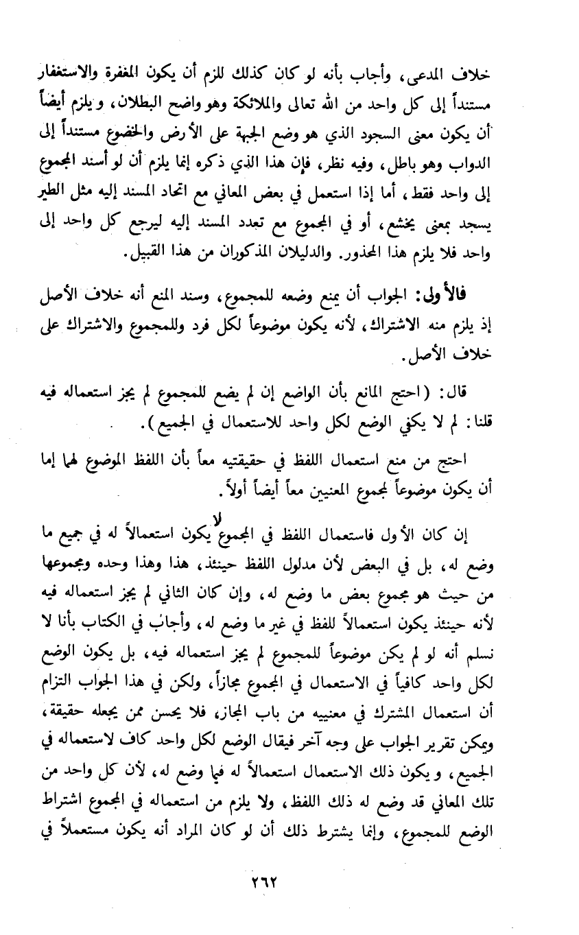 خلاف المدعى وأجاب بأنه لو كان كذلك للزم أن يكون المغفرة والاستغفار مستندا إلى كل واحد من الله تعالى والملائكة وهو واضح البطلان ويلزم أيضا أن يكون معنى السجود الذي هو وضع الجهة على الأرض والخضوع مستندا إلى الداوب وهو باطب وفيه نظر فإن هذا الذي ذكره إنما يلزم أن لو أسند المجموع إلى واحد فقط أما إذا استعمل في بعض المعاني مع اتحاد المستند إليه مثل الطير يسجد بمعنى يخشع أو في المجموع مع تعدد المستند إليه ليرجع كل واحد إلى واحد فلا يلزم هذا المحذور والدليلان المذكوران من هذا القبيل.
