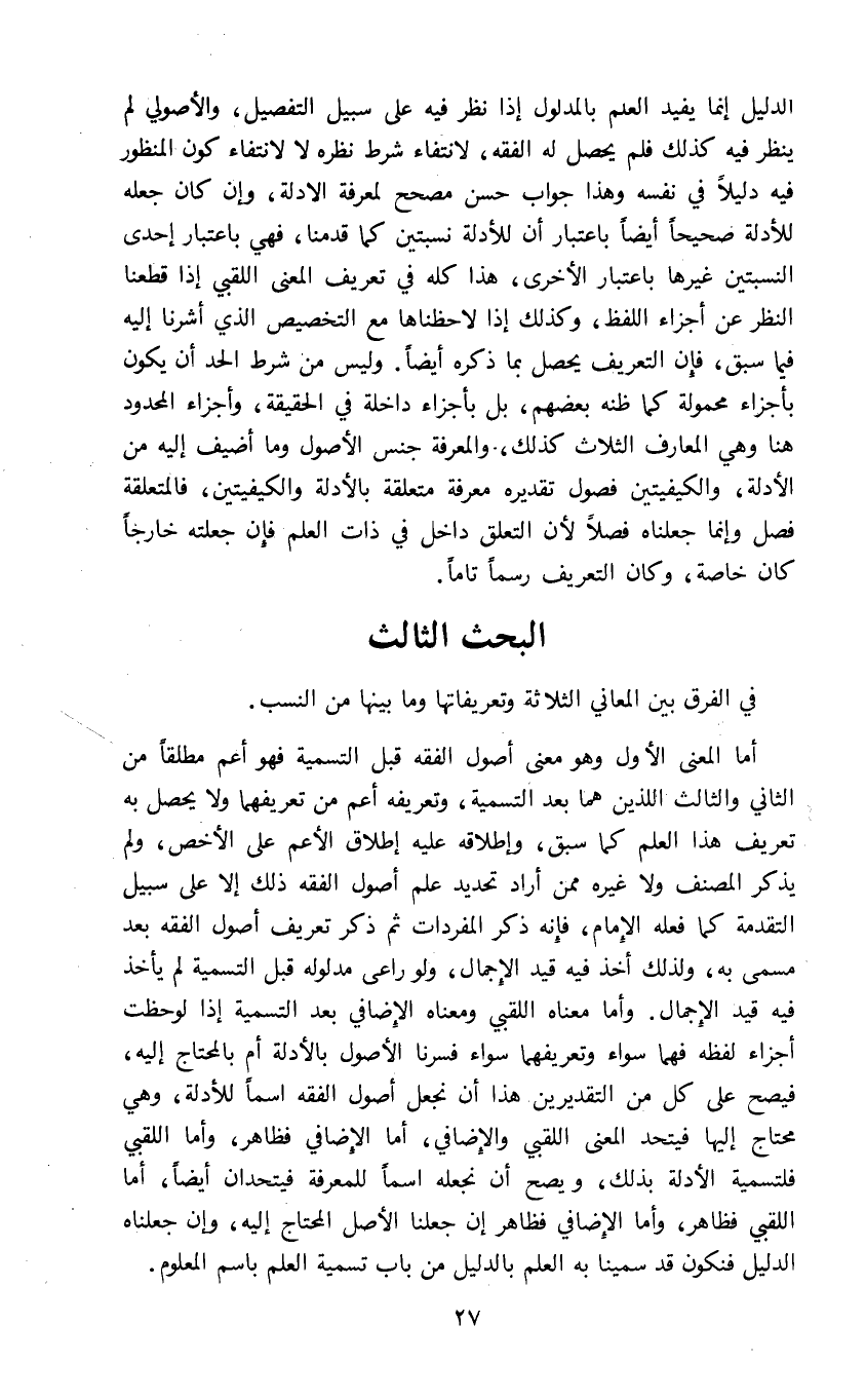 أما المعنى الأول وهو معنى أصول الفقه قبل التسمية فهو أعم مطلقا من الثاني والثالث اللذين هما بعد التسمية وتعريفه أعم من تعريفهما ولا يحصل به تعريف هذا العلم كما سبق وإطلاقه عليه إطلاق الأعم على الأخص ولم يذكر المصنف ولا غيره ممن أراد تحديد علم أصول الفقه ذلك إلا على سبيل التقدمة كما فعله الإمام فإنه ذكر المفردات ثم ذكر تعريف أصول الفقه بعد مسمى به ولذلك أخذ فيه قيد الإجمال ولو راعى مدلوله قبل التسمية لم يأخذ فيه قيد الإجمال وأما معناه اللقبي ومعناه الإضافي بعد التسمية إذا لوحظت أجزاء لفظه فهما سواء وتعريفهما سواء فسرنا الأصول بالأدلة أم بالمحتاج إليه فيصح على كل من التقديرين هذا أن نجعل أصول الفقه اسما للأدلة وهي محتاج إليها فيتحد المعنى اللقبي والإضافي أما الإضافي فظاهر وأما اللقبي فلتسمية الأدلة بذلك ويصح أن نجعله اسما للمعرفة فيتحدان أيضا أما اللقبي فظاهر وأما الإضافي فظاهر إن جعلنا الأصل المحتاج إليه وإن جعلناه الدليل فنكون قد سمينا به العلم بالدليل من باب تسمية العلم باسم المعلوم.