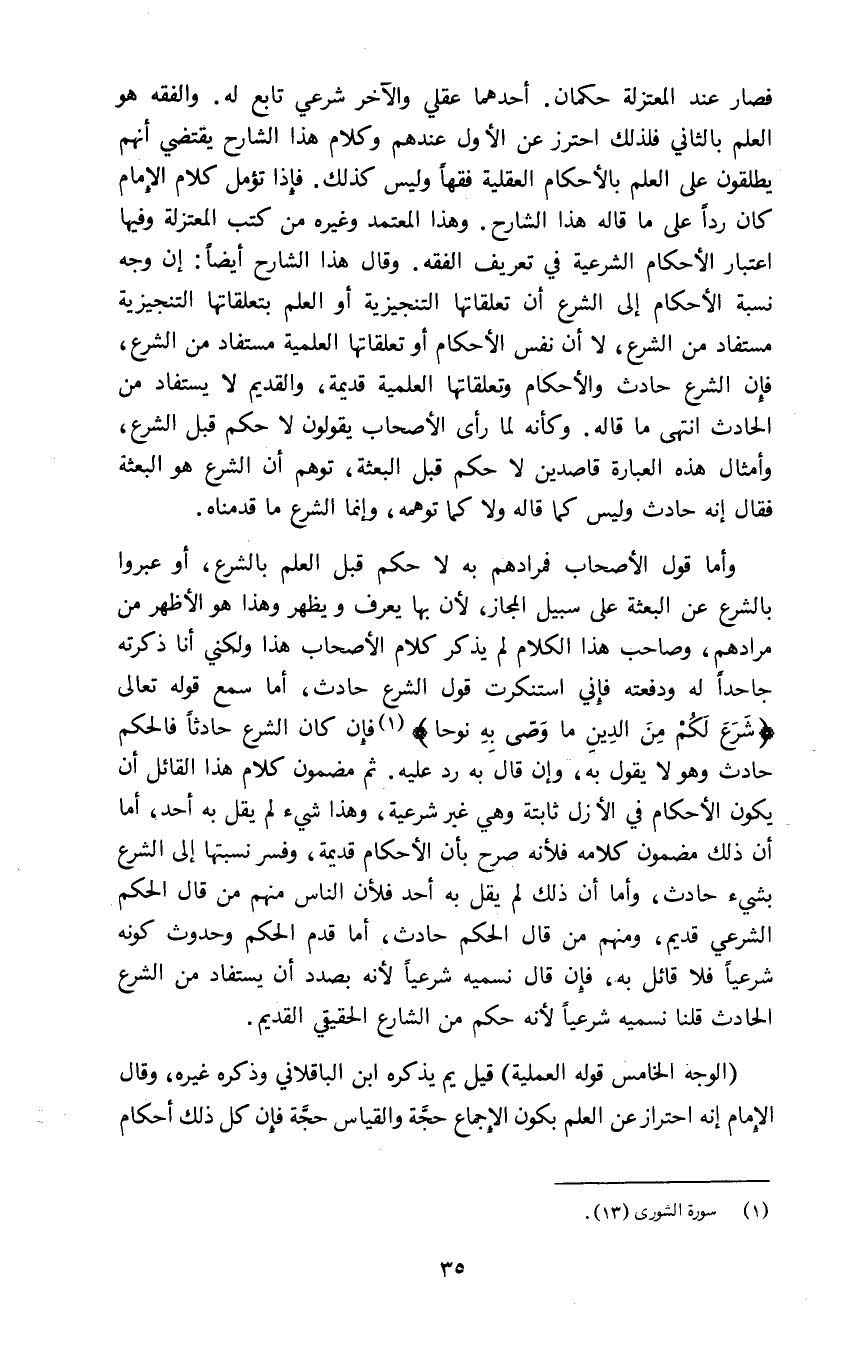 وأما قول الأصحاب فمرادهم به لا حكم قبل العلم بالشرع أو عبروا بالشرع عن البعثة على سبيل المجاز لأن بها يعرف ويظهر وهذا هو الأظهر من مرادهم وصاحب هذا الكلام لم يذكر كلام الأصحاب هذا ولكني أنا ذكرته جاحدا له ودفعته فإني استنكرت قول الشرع حادث أما سمع قوله تعالى: {شَرَعَ لَكُمْ مِنَ الدِّينِ مَا وَصَّى بِهِ نُوحاً} 1 فإن كان الشرع حادثا فالحكم حادث وهو لا يقول به وإن قال به رد عليه ثم مضمون كلام هذا القائل أن يكون الأحكام في الأزل ثابتة وهي غير شرعية وهذا شيء لم يقل به أحد أما أن ذلك مضمون كلامه فلأنه صرح بأن الأحكام قديمة وفسر نسبتها إلى الشرع بشيء حادث وأما أن ذلك لم يقل به أحد فلأن الناس منهم من قال الحكم الشرعي قديم ومنهم من قال الحكم حادث أما قدم الحكم وحدوث كونه شرعيا فلا قائل به فإن قال نسميه شرعيا لأنه بصدد أن يستفاد من الشرع الحادث قلنا نسميه شرعيا لأنه حكم من الشارع الحقيقي القديم.
