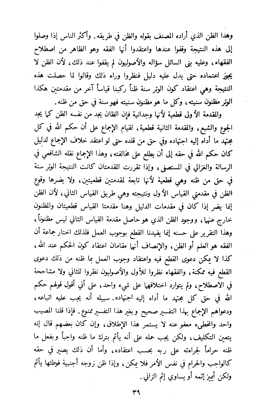 والمقدمة الأولى قطعية لأنها وجدانية فإن الظان يجد من نفسه الظن كما يجد الجوع والشبع والمقدمة الثانية قطعية لقيام الإجماع على أن حكم الله في كل مجتهد ما أداه إليه اجتهاده وفي حق من قلده حتى لو اعتقد خلاف الإجماع لدليل كان حكم الله في حقه إلى أن يطلع على مخالفته وهذا الإجماع نقله الشافعي في الرسالة والغزالي في المستصفى وإذا تقررت المقدمتان كانت النتيجة الوتر سنة في حق من ظنه وهي قطعية لأنها تابعة لمقدمتين قطعيتين ولا يضرها وقوع الظن في مقدمتي القياس الأول ونتيجته وهي طريق القياس الثاني لأن الظن إنما يضر إذا كان في مقدمات الدليل وهنا مقدمتا القياس قطعيتان والمظنون خارج عنهما ووجود الظن الذي هو حاصل مقدمة القياس الثاني ليس مظنونا وهذا التقرير على حسنه إنما يفيدنا القطع بوجوب العمل فلذلك اختار جماعة أن الفقه هو العلم أو الظن والإنصاف أنهما مقامان اعتقاد كون الحكم عند الله كذا لا يمكن دعوى القطع فيه واعتقاد وجوب العمل بما ظنه من ذلك دعوى القطع فيه ممكنة والفقهاء نظروا للأول والأصوليون نظروا للثاني ولا مشاححة في الاصطلاح ولم يتوارد اختلافهما على شيء واحد على أني أقول قولهم حكم الله في حق كل مجتهد ما أداه إليه اجتهاده سبيله أنه يجب عليه اتباعه ودعواهم الإجماع بهذا التفسير صحيح وبغير هذا التفسير ممنوع فإذا قلنا المصيب واحد والمخطيء معفو عنه لا يستمر هذا الإطلاق وإن كان بعضهم قال إنه يتعين التكليف ولكن يجب حمله على أنه يأثم بترك ما ظنه واجبا وبفعل ما ظنه حراما لجراءته على ربه بحسب اعتقاده وأما أن ذلك يصير في حقه كالواجب والحرام في نفس الأمر فلا يمكن وإذا ظن زوجه أجنبيه فوطئها يأثم ولكن أيميز إثمه أو يساوي إثم الزاني.