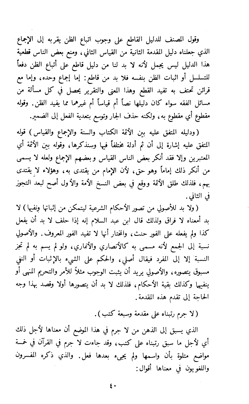 وقول المصنف للدليل القاطع على وجوب اتباع الظن يقربه إلى الإجماع الذي جعلناه دليل المقدمة الثانية من القياس الثاني ومنع بعض الناس قطعيا قطعية هذا الدليل ليس يجمل لأنه لا بد لنا من دليل قاطع على اتباع الظن دفعا للتسلسل أو اثبات الظن بنفسه فلا بد من قاطع أما إجماع وحده وإما مع قرائن تحتف به تفيد القطع وهذا المعنى والتقرير يحصل في كل مسألة من مسائل الفقه سواء كان دليلها نصا أم قياسا أم غيرهما مما يفيد الظن وقوله مقطوع أي مقطوع به ولكنه حذف الجار وتوسع بتعدية الفعل إلى الضمير.