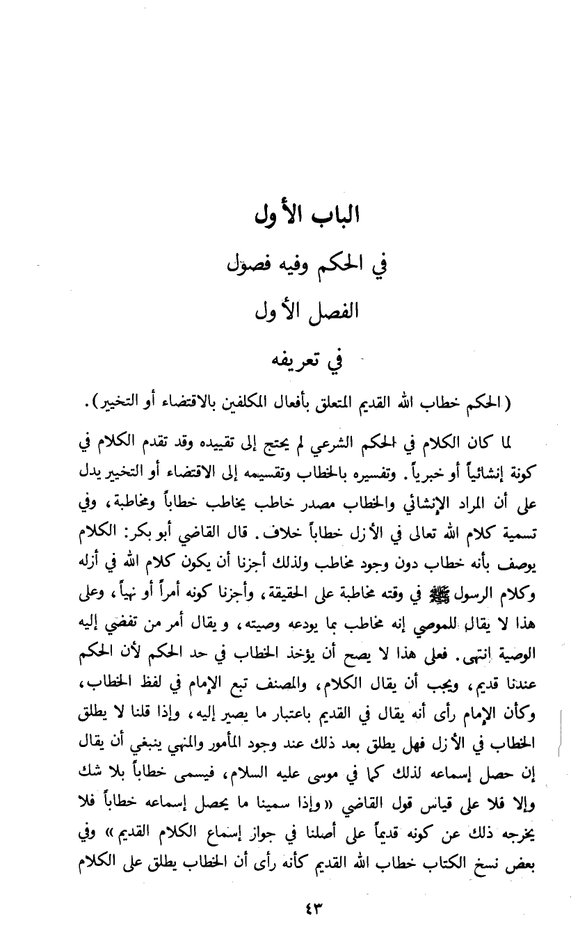"الحكم خطاب الله القديم المتعلق بأفعال المكلفين بالاقتضاء أو التخيير".