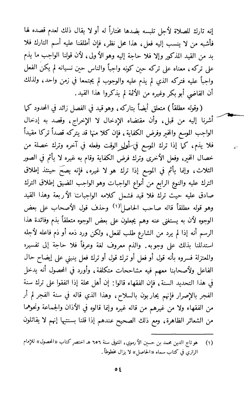 "وقوله مطلقا" متعلق أيضا بتاركه وهو قيد في الفصل زائد في المحدود كما أشرنا إليه من قبل وأن مقتضاه الإدخال لا الإخراج وقصد به إدخال الواجب الموسع والمخير وفرض الكفاية فإن كلا منها قد يتركه قصدا تركا مقيدا فلا يذم كما إذا ترك الموسع في أول الوقت وفعله في آخره وترك خصلة من خصال المخير وفعل الأخرى وترك فرض الكفاية وقام به غيره لا يأثم في الصور الثلاث وإنما يأثم في الموسع إذا ترك هو لا غيره فإنه يصح حينئذ إطلاق الترك عليه والنوع الرابع من أنواع الواجبات وهو الواجب المضيق إطلاق الترك صادق عليه حيث ترك فلا قيد فشمل كلامه الواجبات الأربعة وهذا القيد وهو قوله مطلقا قاله صاحب الحاصل1 وحذف قول الأصحاب على بعض الوجوه لأن به يستغنى عنه وهم يجعلون على بعض الوجوه متعلقا بذم وفائدة هذا الرسم أنه إذا لم يرد من الشارع طلب لفعل ولكن ورد ذمه أو ذم فاعله لأجله استدللنا بذلك على وجوبه والذم معروف لغة وعرفا فلا حاجة إلى تفسيره والمعتزلة فسروه بأنه قول أو فعل أو ترك قول أو ترك فعل ينبني على إيضاح حال الفاعل ولأصحابنا معهم مشاححات متكلفة وأورد في المحصول أنه يدخل في هذا التحديد السنة فإن الفقهاء قالوا إن أهل محلة إذا اتفقوا على ترك سنة الفجر بالإصرار فإنهم يحاربون بالسلاح وهذا الذي قاله في سنة الفجر لم أر من الفقهاء ولا من غيرهم من قاله غيره وإنما قالوه في الأذان والجماعة ونحوهما من الشعائر الظاهرة ومع ذلك الصحيح عندهم إذا قلنا بسنتيها إنهم لا يقاتلون