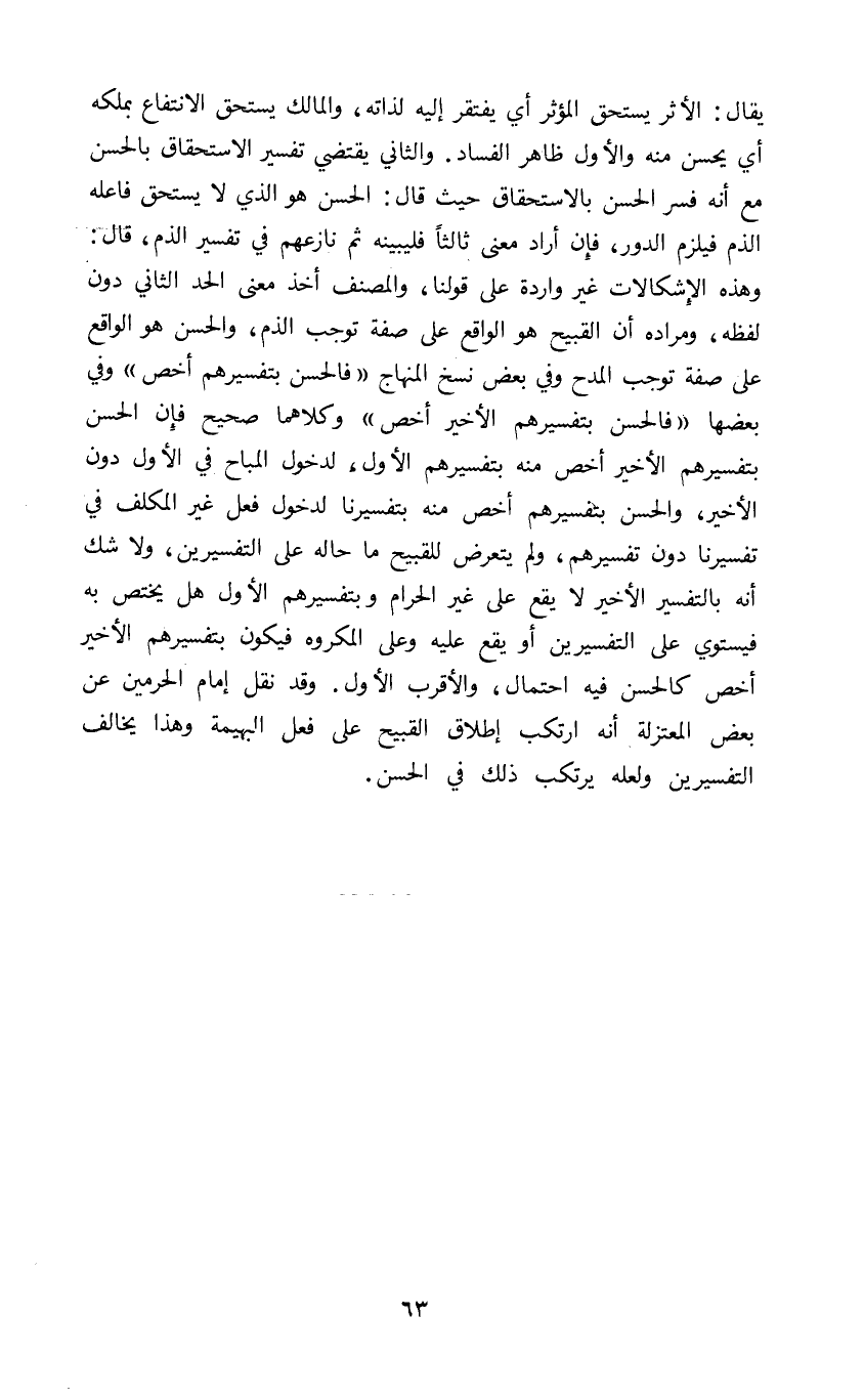 يقال: الأثر يستحق المؤثر أي يفتقر إليه لذاته والمالك يستحق الانتفاع بملكه أي يحسن منه والأول ظاهر الفساد والثاني يقتضي تفسير الاستحقاق بالحسن مع أنه فسر الحسن بالاستحقاق حيث قال الحسن هو الذي لا يستحق فاعله الذم فيلزم الدور فإن أراد معنى ثالثا فليبينه ثم نازعهم في تفسير الذم قال وهذه الإشكالات غير واردة على قولنا والمصنف أخذ معنى الحد الثاني دون لفظه ومراده أن القبيح هو الواقع على صفة توجب الذم والحسن هو الواقع على صفة توجب المدح وفي بعض نسخ المنهاج "فالحسن بتفسيرهم أخص" وفي بعضها "فالحسن بتفسيرهم الأخير أخص" وكلاهما صحيح فإن الحسن بتفسيرهم الأخير أخص منه بتفسيرهم الأول لدخول المباح في الأول دون الأخير والحسن بتفسيرهم أخص منه بتفسيرنا لدخول فعل غير المكلف في تفسيرنا دون تفسيرهم ولم يتعرض للقبيح ما حاله على التفسيرين ولا شك أنه بالتفسير الأخير لا يقع على غير الحرام وبتفسيرهم الأول هل يختص به فيستوي على التفسيرين أو يقع عليه وعلى المكروه فيكون بتفسيرهم الأخير أخص كالحسن فيه احتمال والأقرب الأول وقد نقل إمام الحرمين عن بعض المعتزلة أنه ارتكب إطلاق القبيح على فعل البهيمة وهذا يخالف التفسيرين ولعله يرتكب ذلك في الحسن.