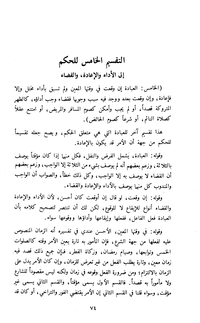 "الخامس العبادة إن وقعت في وقتها المعين ولم تسبق بأداء مختل وإلا فإعادة وإن وقعت بعده ووجد فيه سبب وجوبها فقضاء وجب أداؤه كالظهر المتروكة قصدا أو لم يجب وأمكن كصوم المسافر والمريض أو امتنع عقلا كصلاة النائم أو شرعا كصوم الحائض".
