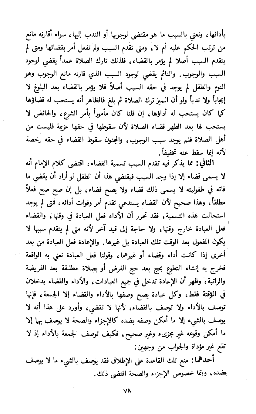 الثاني: مما يذكر فيه تقدم السبب تسمية القضاء اقتضى كلام الإمام أنه لا يسمى قضاء إلا إذا وجد السبب فيقتضي هذا أن الطفل لو أراد أن يقضي ما فاته في طفوليته لا يسمى ذلك قضاء ولا يصح قضاء بل إن صح صح فعلا مطلقا وهذا صحيح لأن القضاء يستدعي تقدم أمر وفوات أدائه فمتى لم يوجد استحالت هذه التسمية فقد تحرر أن الأداء فعل العبادة في وقتها والقضاء فعل العبادة خارج وقتها ولا حاجة إلى قيد آخر لأنه متى لم يتقدم سببها لا يكون المفعول بعد الوقت تلك العبادة بل غيرها والإعادة فعل العبادة من بعد أخرى إذا كانت أداء وقضاء أو غيرهما وقولنا فعل العبادة نعني به الواقعة فخرج به إنشاء التطوع التطوع بحج بعد حج الفرض أو بصلاة مطلقة بعد الفريضة والراتبة وظهر أن الإعادة تدخل في جميع العبادات والأداء والقضاء يدخلان في المؤقتة فقط وكل عبادة يصح وصفها بالأداء والقضاء إلا الجمعة فإنها توصف بالأداء ولا توصف بالقضاء لأنها لا تقضي وأورد على هذا أنه لا يوصف بالشيء إلا ما أمكن وصفه بضده كالأجزاء والصحة لا يوصف بهما إلا ما أمكن وقوعه غير مجزئ وغير صحيح فكيف توصف الجمعة بالأداء إذ لا تقع غير مؤداة والجواب من وجهين:
