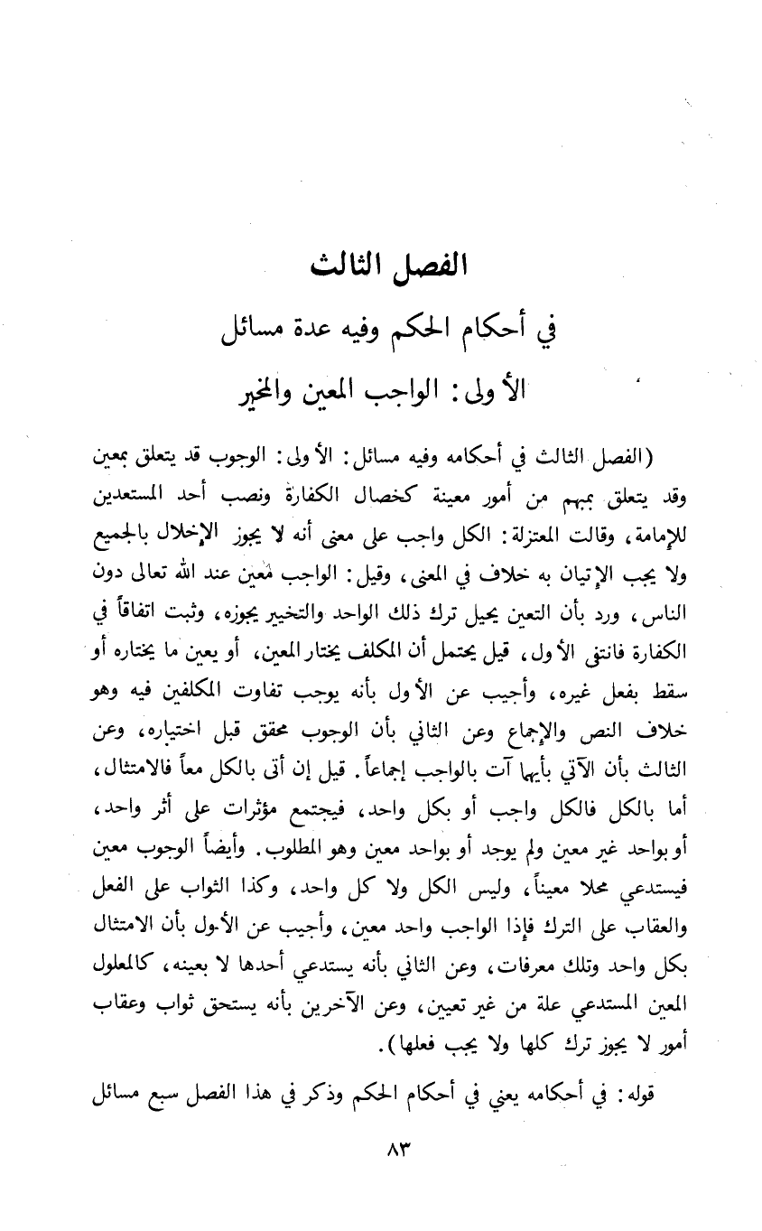 "الفصل الثالث في أحكامه وفيه مسائل الأولى الوجوب قد يتعلق بمعين وقد يتعلق بمبهم من أمور معينة كخصال الكفارة ونصب أحد المستعدين للإمامة وقالت المعتزلة الكل واجب على معنى أنه لا يجوز الإخلال بالجميع ولا يجب الإتيان به خلاف في المعنى وقيل الواجب معين عند الله تعالى دون الناس ورد بأن التعين يحيل ترك ذلك الواحد والتخيير يجوزه وثبت اتفاقا في الكفارة فانتفى الأول قيل يحتمل أن المكلف يختار المعين أو يعين ما يختاره أو سقط بفعل غيره وأجيب عن الأول بأنه يوجب تفاوت المكلفين فيه وهو خلاف النص والإجماع وعن الثاني بأن الوجوب محقق قبل اختياره وعن الثالث بأن الآتي بأيهما آت بالواجب إجماعا قيل إن أتى بالكل معا فالامتثال أما بالكل فالكل واجب أو بكل واحد فيجتمع مؤثرات على أثر واحد أو بواحد غير معين ولم يوجد أو بواحد معين وهو المطلوب وأيضا الوجوب معين فيستدعي محلا معينا وليس الكل ولا كل واحد وكذا الثواب على الفعل والعقاب على الترك فإذا الواجب واحد معين وأجيب عن الأول بأن الامتثال بكل واحد وتلك معرفات وعن الثاني بأنه يستدعي أحدها لا بعينه كالمعلول المعين المستدعي علة من غير تعيين وعن الآخرين بأنه يستحق ثواب وعقاب أمور لا يجوز ترك كلها ولا يجب فعلها".