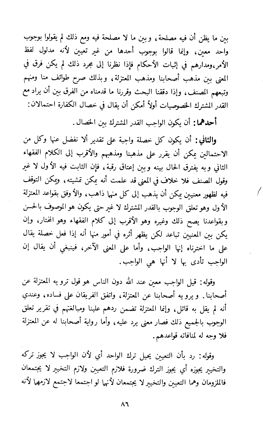 بين ما يظن أن فيه مصلحة وبين ما لا مصلحة فيه ومع ذلك لم يقولوا بوجوب واحد معين وإنما قالوا بوجوب أحدها من غير تعيين لأنه مدلول لفظ الأمر ومدارهم في إثبات الأحكام فإذا نظرنا إلى مجرد ذلك لم يكن فرق في المعنى بين مذهب أصحابنا ومذهب المعتزلة وبذلك صرح طوائف منا ومنهم وتبعهم المصنف وإذا دققنا البحث وقررنا ما قدمناه من الفرق بين أن يراد مع القدر المشترك الخصوصيات أولا أمكن أن يقال في خصال الكفارة احتمالان: