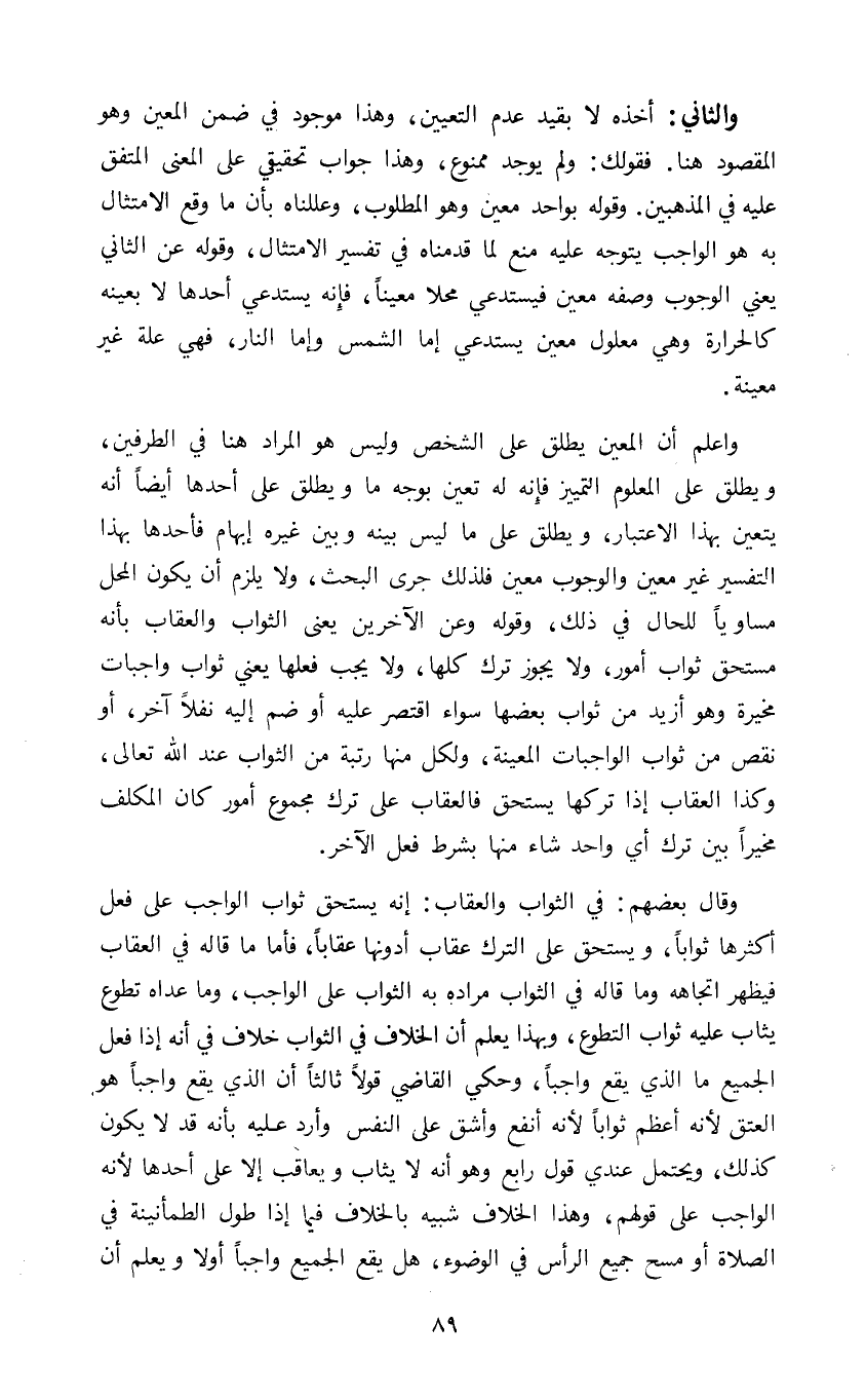 والثاني: أخذه لا بقيد عدم التعيين وهذا موجود في ضمن المعين وهو المقصود هنا فقولك ولم يوجد ممنوع وهذا جواب تحقيقي على المعنى المتفق عليه في المذهبين وقوله بواحد معين وهو المطلوب وعللناه بأن ما وقع الامتثال به هو الواجب يتوجه عليه منع لما قدمناه في تفسير الامتثال وقوله عن الثاني يعني الوجوب وصفه معين فيستدعي محلا معينا فإنه يستدعي أحدها لا بعينه كالحرارة وهي معلول معين يستدعي إما الشمس وإما النار فهي علة غير معينة.