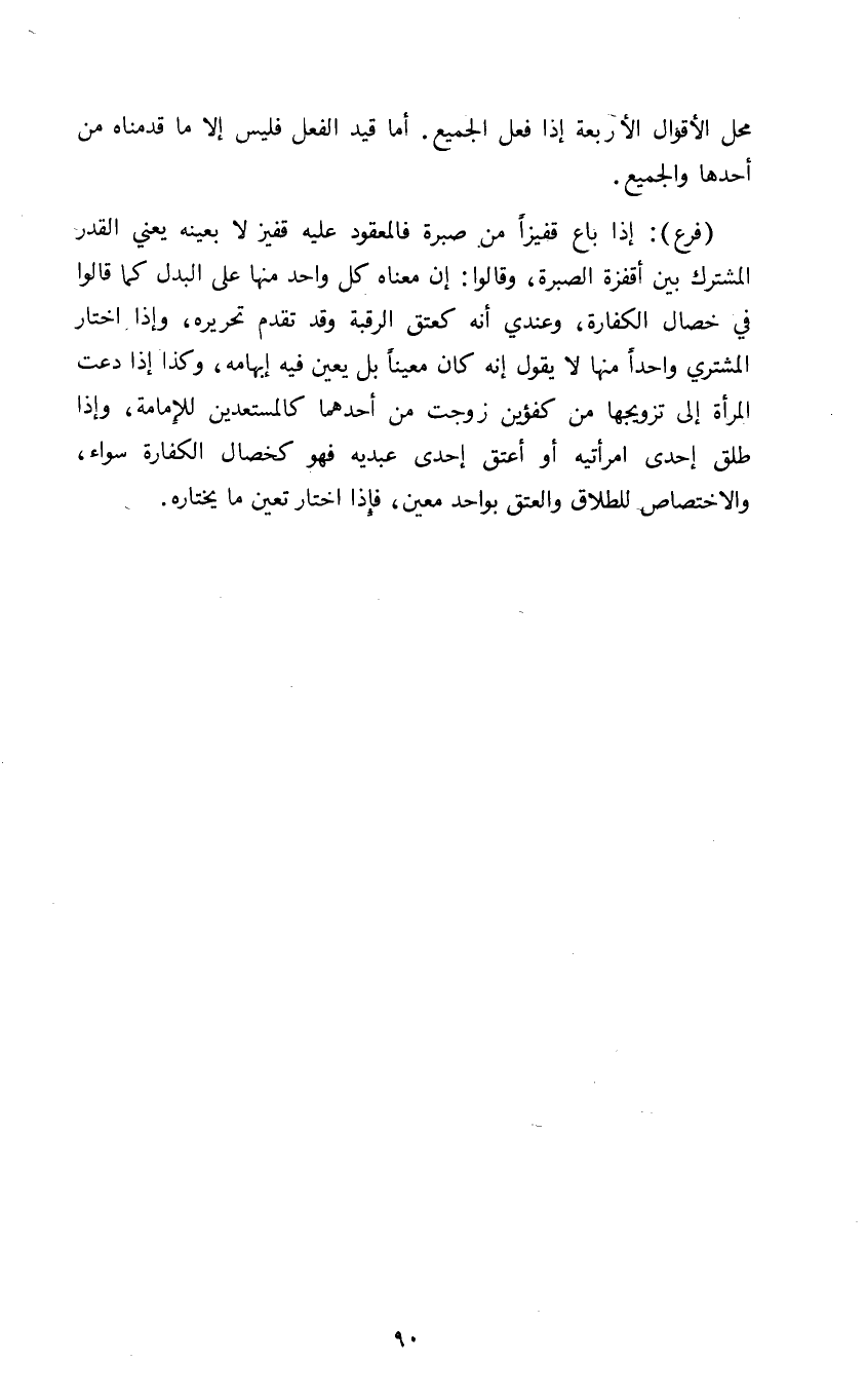 "فرع": إذا باع قفيزا من صبرة فالمعقود عليه قفيز لا بعينه يعني القدر المشترك بين أقفزة الصبرة وقالوا إن معناه كل واحد منها على البدل كما قالوا في خصال الكفارة وعندي أنه كعتق الرقبة وقد تقدم تحريره وإذا اختار المشتري واحدا منها لا يقول إنه كان معينا بل يعين فيه إبهامه وكذا إذا دعت المرأة إلى تزويجها من كفؤين زوجت من أحدهما كالمستعدين للإمامة وإذا طلق إحدى امرأتيه أو أعتق إحدى عبديه فهو كخصال الكفارة سواء والاختصاص للطلاق والعتق بواحد معين فإذا اختار تعين ما يختاره.