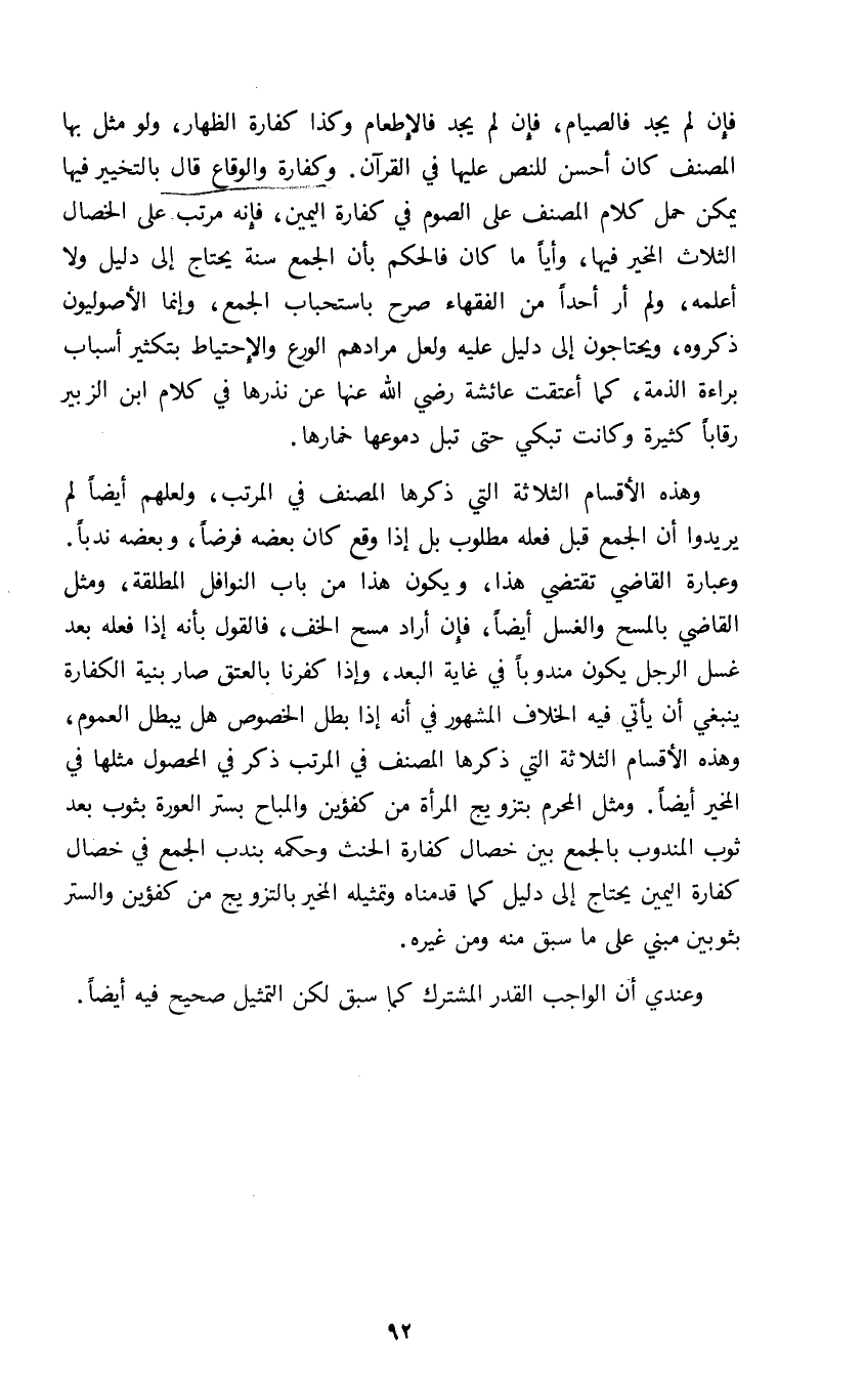 فإن لم يجد فالصيام فإن لم يجد فالإطعام وكذا كفارة الظهار ولو مثل بها المصنف كان أحسن للنص عليها في القرآن وكفارة والوقاع قال بالتخيير فيها يمكن حمل كلام المصنف على الصوم في كفارة اليمين فإنه مرتب على الخصال الثلاث المخير فيها وأيا ما كان فالحكم بأن الجمع سنة يحتاج إلى دليل ولا أعلمه ولم أر أحدا من الفقهاء صرح باستحباب الجمع وإنما الأصوليون ذكروه ويحتاجون إلى دليل عليه ولعال مرادهم الورع والإحتياط بتكثير أسباب براءة الذمة كما أعتقت عائشة رضي الله عنها عن نذرها في كلام ابن الزبير رقابا كثيرة وكانت تبكي حتى تبل دموعها خمارها.