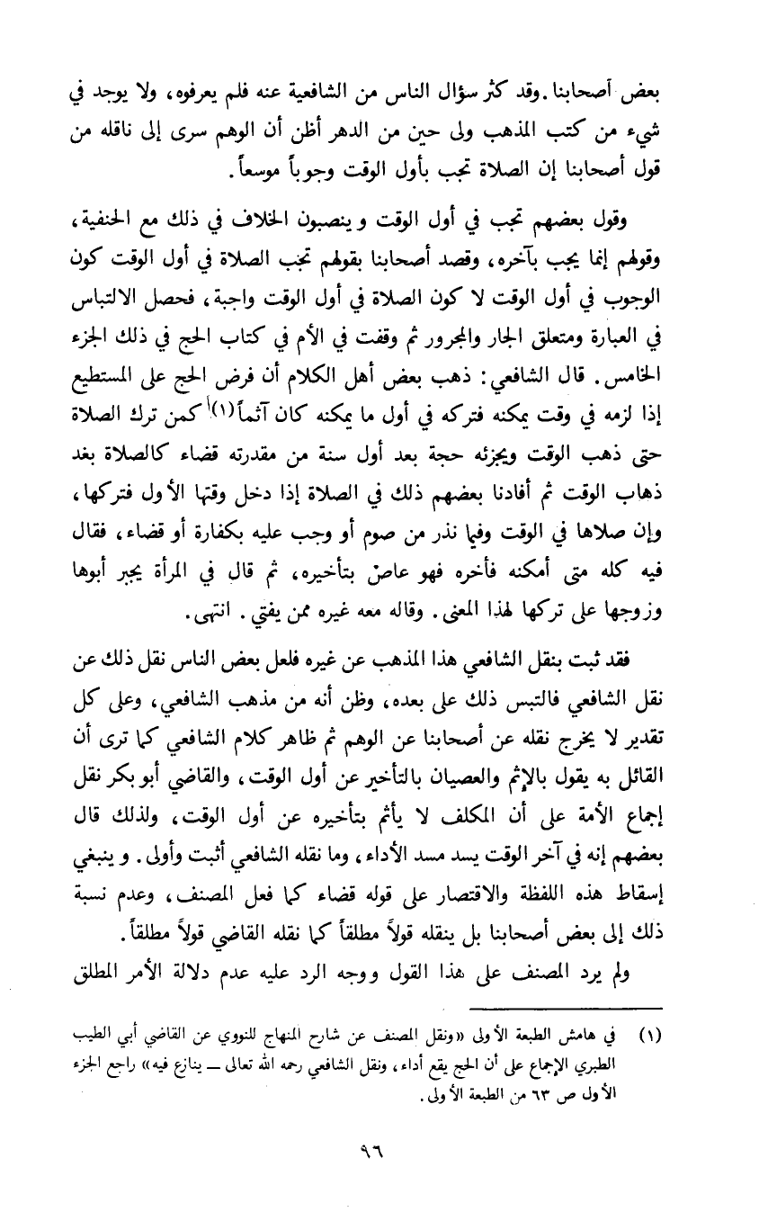 وقول بعضهم تجب في أول الوقت وينصبون الخلاف في ذلك مع الحنفية وقولهم إنما يجب بآخره وقصد أصحابنا بقولهم تجب الصلاة في أول الوقت كون الوجوب في أول الوقت لا كون الصلاة في أول الوقت واجبة فحصل الالتباس في العبارة ومتعلق الجار والمجرور ثم وقفت في الأم في كتاب الحج في ذلك الجزء الخامس. قال الشافعي: ذهب بعض أهل الكلام أن فرض الحج على المستطيع إذا لزمه في وقت يمكنه فتركه في أول ما يمكنه كان آثما1 كمن ترك الصلاة حتى ذهب الوقت ويجزئه حجة بعد أول سنة من مقدرته قضاء كالصلاة بعد ذهاب الوقت ثم أفادنا بعضهم ذلك في الصلاة إذا دخل وقتها الأول فتركها وإن صلاها في الوقت وفيما نذر من صوم أو وجب عليه بكفارة أو قضاء فقال فيه كله متى أمكنه فأخره فهو عاص بتأخيره ثم قال في المرأة يجبر أبوها وزوجها على تركها لهذا المعنى وقاله معه غيره ممن يفتي انتهى.