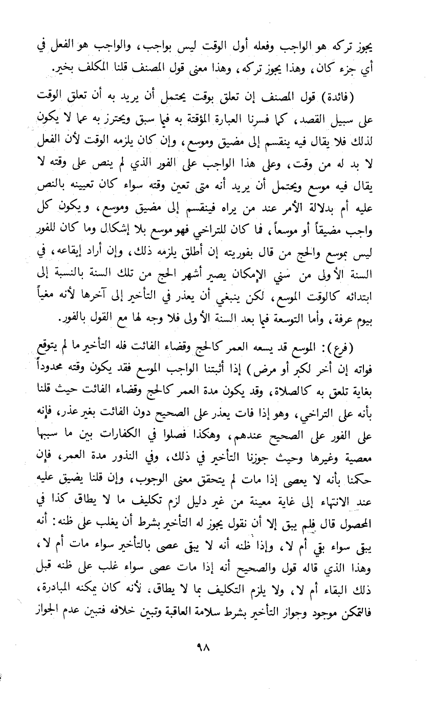 فرع: الموسع قد يسعه العمر كالحج وقضاء الفائت فله التأخير ما لم يتوقع فواته إن أخر لكبر أو مرض إذا أثبتنا الواجب الموسع فقد يكون وقته محدودا بغاية تعلق به كالصلاة وقد يكون مدة العمر كالحج وقضاء الفائت حيث قلنا بأنه على التراخي وهو إذا فات يعذر على الصحيح دون الفائت بغير عذر فإنه على الفور على الصحيح عندهم وهذكا فصلوا في الكفارات بين ما سببها معصية وغيرها وحيث جوزنا التأخير في ذلك وفي النذور مدة العمر فإن حكمنا بأنه لا يعصى إذا مات لم يتحقق معنى الوجوب وإن قلنا يضيق عليه عند الانتهاء إلى غاية معينة من غير دليل لزم تكليف ما لا يطاق كذا في المحصول قال فلم يبق إلا أن نقول يجوز له التأخير بشرط أن يغلب على ظنه أنه يبقى سواء بقي أم لا وإذا ظنه أنه لايبقى عصى بالتأخير سواء مات أم لا وهذا الذي قاله قول والصحيح أنه إذا مات عصى سواء غلب على ظنه قبل ذلك البقاء أم لا ولا يلزم التكليف بما لا يطاق لأنه كان يمكنه المبادرة فالتمكن موجود وجواز التأخير بشرط سلامة العاقبة وتبين خلافه فتبين عدم الجواز