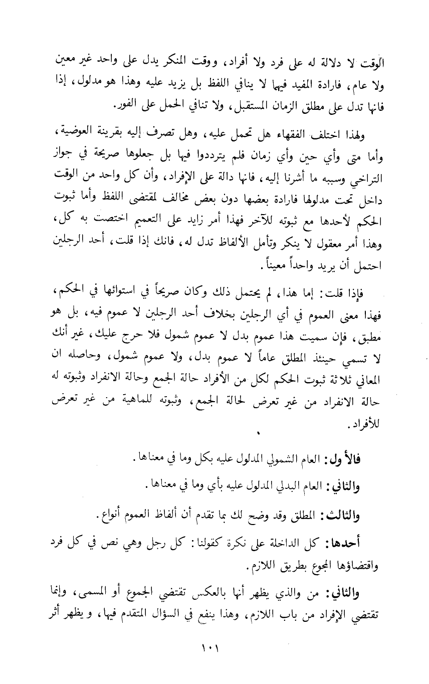 هذا هو الضرب الثاني: هو ما يفيد العموم من جهة اللغة لا من جهة وضعه له بل بواسطة اقتران قرينة وهو على وجهين.