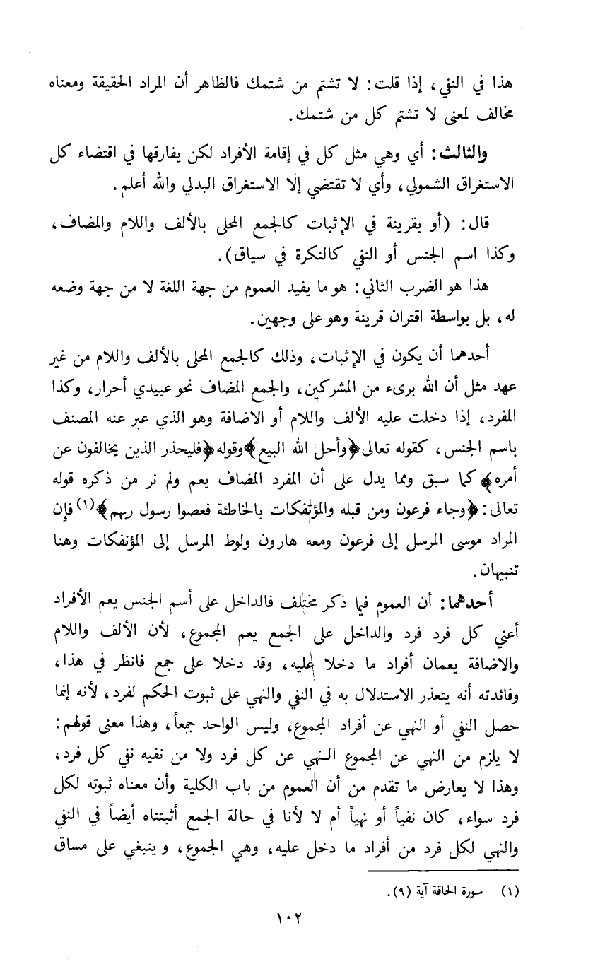أحدهما: أن يكون في الاثبات وذلك كالجمع المحلى بالألف واللام من غير عهد مثل أن الله بريء من المشركين والجمع المضاف نحو عبيدي أحرار وكذا المفرد إذا دخلت عليه الألف واللام أو الإضافة وهو الذي عبر عنه المصنف باسم الجنس كقوله تعالى: {وَأَحَلَّ اللَّهُ الْبَيْعَ} وقوله: {فَلْيَحْذَرِ الَّذِينَ يُخَالِفُونَ عَنْ أَمْرِهِ} كما سبق ومما يدل على أن المفرد المضاف يعم ولم نر من ذكره قوله تعالى: {وَجَاءَ فِرْعَوْنُ وَمَنْ قَبْلَهُ وَالْمُؤْتَفِكَاتُ بِالْخَاطِئَةِ فَعَصَوْا رَسُولَ رَبِّهِمْ} 1 فان المراد موسى المرسل إلى فرعون ومعه هارون ولوط المرسل إلى المؤتفكات وهنا تنبيهان.