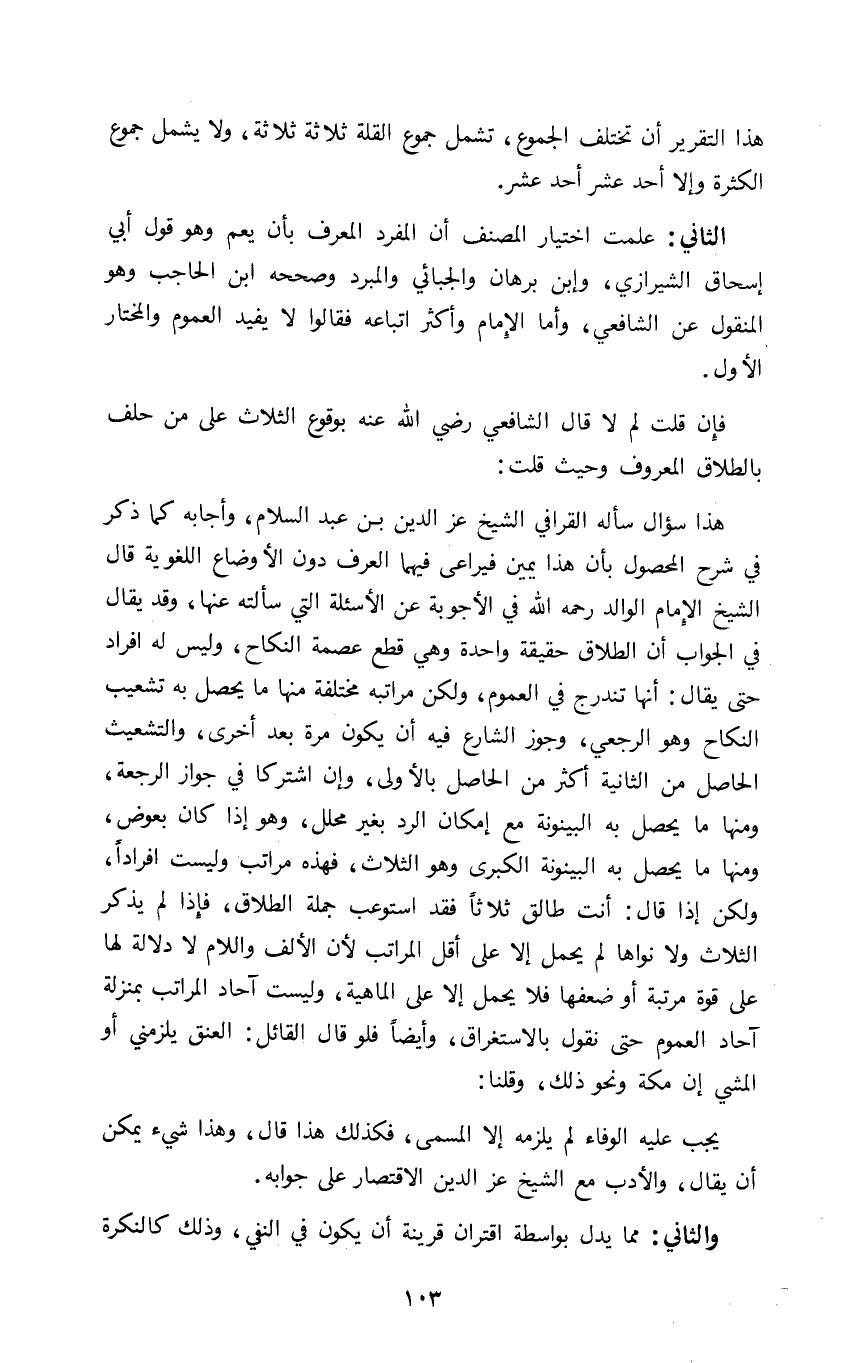 هذا سؤال سأله القرافي الشيخ عز الدين بن عبد السلام وأجابه كما ذكر في شرح المحصول بأن هذا يمين فيراعي فيهما العرف دون الأوضاع اللغوية قال الشيخ الإمام الوالد رحمه الله في الأجوبة عن الأسئلة التي سألته عنها وقد يقال في الجواب ان الطلاق حقيقة واحدة وهي قطع عصمة النكاح وليس له أفراد حتى يقال أنها تندرج في العموم ولكن مراتبه مختلفة منها ما يحصل به تشعيب النكاح وهو الرجعي وجوز الشارع فيه ان يكون مرة بعد أخرى والتشعيب الحاصل من الثانية اكثر من الحاصل بالأولى وان اشتركا في جواز الرجعة ومنها ما يحصل به البينونة مع إمكان الرد بغير محلل وهو إذا كان بعوض ومنها ما يحصل به البينونة الكبرى وهو الثلاث فهذه مراتب وليست إفرادا ولكن إذا قال أنت طالق ثلاثا فقد استوعب جملة الطلاق فإذا لم يذكر الثلاث ولا نواها لم يحمل الا على اقل المراتب لان الألف واللام لا دلالة لها على قوة مرتبة أو ضعفها فلا يحمل الا على الماهية وليست آحاد المراتب بمنزلة أحاد العموم حتى نقول بالاستغراق وأيضا فلو قال القائل العنق يلزمني أو المشي ان مكة ونحو ذلك وقلنا: