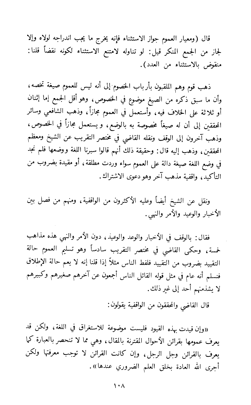 فقال: بالوقف في الاخبار والوعد والوعيد دون الامر والنهي هذه مذاهب خمسة وحكى القاضي في تختصر التقريب سادسا وهو تسليم العموم حالة التقييد بضروب من التقييد فلفظ الناس مثلا إذا قلنا انه لا يعم حالة الاطلاق فنسلم انه عام في مثل قوله القائل الناس أجمعون عن آخرهم صغيرهم وكبيرهم لا يشذ منهم أحد إلى غير ذلك.
