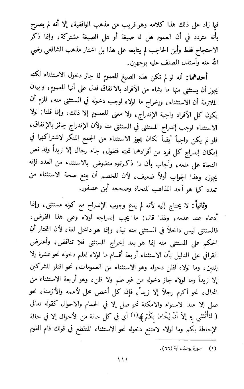 وثانيا: لا يحتاج إليه لأنه لم يدع وجوب الاندراج مع كونه مستثنى وانما ادعاه عند عدمه ولهذا قال ما يجب اندراجه لولاه وعلى هذا الفرض فالمستثنى ليس داخلا في المستثنى منه نية وإنما هو داخل لغة لأن المختار أن الحكم على المستثنى منه إنما هو بعد إخراج المستثنى فلا تناقض واعترض القرافي على الدليل بان الاستثناء أربعة أقسام ما لولاه لعلم دخوله نحو عشرة الا اثنين وما لولاه لظن دخوله وهو الاستثناء من العمومات نحو اقتلوا المشركين الا زيدا وما لولاه لجاز دخوله من غير علم ولا ظن وهو أربعة الاستثناء من المحال نحو اكرم رجلا الا زيدا فان كل أخص محل لأعمه والأزمنة نحو صل الا عند الاستواء والأمكنة نحو صل الا في الحمام والأحوال كقوله تعالى: {لَتَأْتُنَّنِي بِهِ إِلَّا أَنْ يُحَاطَ بِكُمْ} 1 أي في كل حالة من الأحوال الا في حالة الإحاطة بكم وما لولاه لامتنع دخوله نحو الاستثناء المنقطع في قولك قام القوم