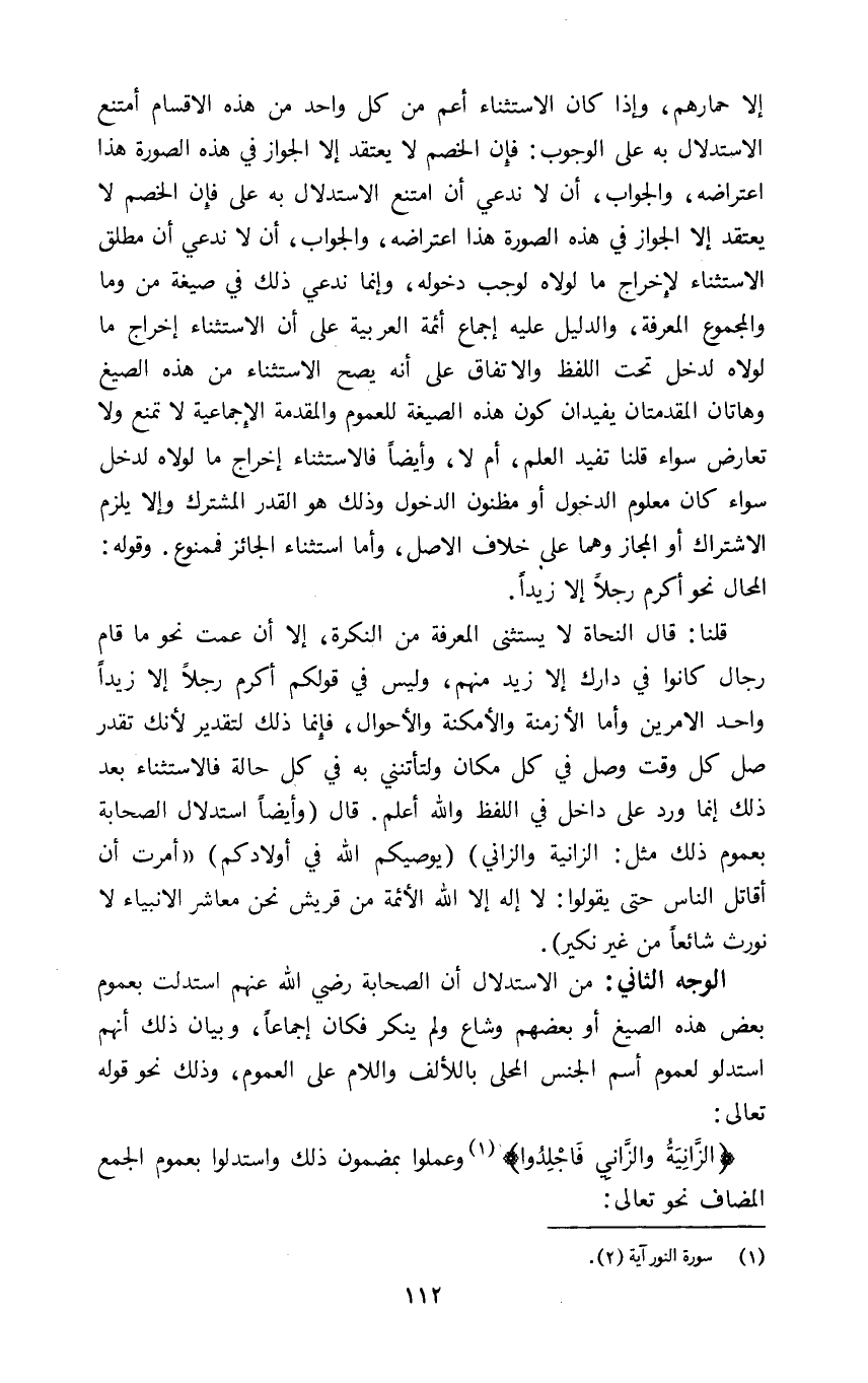 قلنا: قال النحاة لا يستثنى المعرفة من النكرة الا ان عمت نحو ما قام رجال كانوا في دارك الا زيد منهم وليس في قولكم اكرم رجلا الا زيدا واحدا الأمرين واما الأزمنة والأمكنة والأحوال فإنما ذلك لتقدير لأنك تقدر صل كل وقت وصل في كل مكان ولتاتنني به في كل حاله فالاستثناء بعد ذلك إنما ورد على داخل في اللفظ والله اعلم قال وأيضا استدلال الصحابة بعموم ذلك مثل: {الزَّانِيَةُ وَالزَّانِي} {يُوصِيكُمُ اللَّهُ فِي أَوْلادِكُمْ} أمرت ان أقاتل الناس حتى يقولوا لا اله الا الله الأئمة من قريش نحن معاشر الأنبياء لا نورث شائعا من غير نكير.