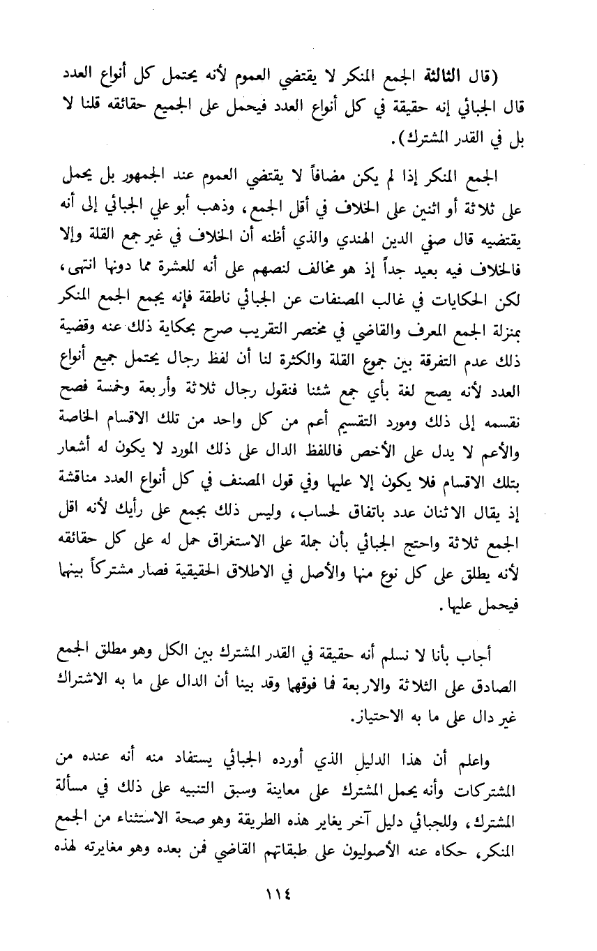 واعلم ان هذا الدليل الذي أورده الجبائي يستفاد منه انه عنده من المشتركات وانه يحمل المشترك على معاينة وسبق التنبيه على ذلك في مسالة المشترك وللجبائي دليل آخر يغاير هذه الطريقة وهو صحة الاستثناء من الجمع المنكر حكاه عنه الأصوليون على طبقاتهم القاضي فمن بعده وهو مغايرته لهذه