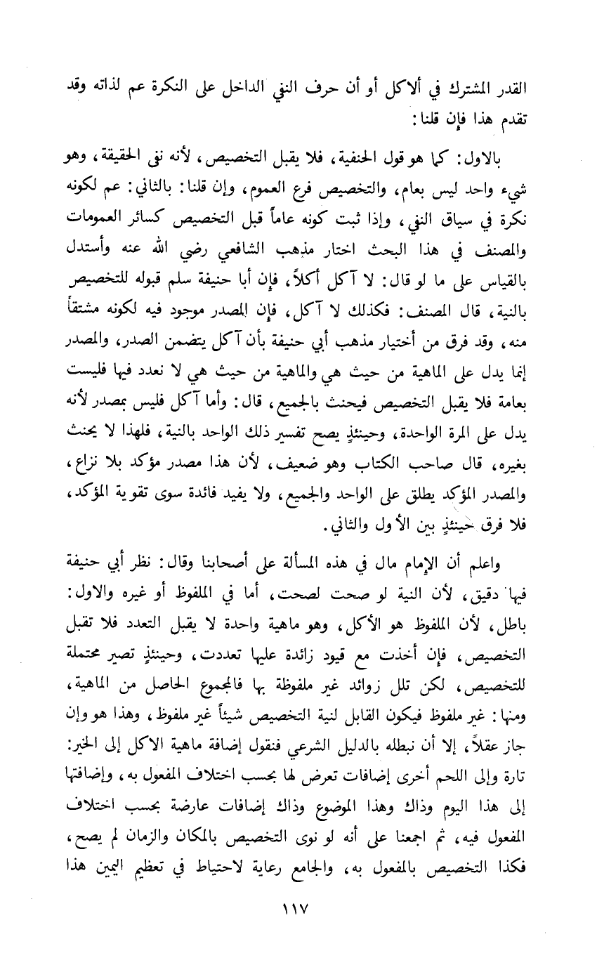 واعلم ان الأمام مال في هذه المسالة على أصحابنا وقال نظر أبى حنيفة فيها دقيق لان النية لصحت أما في الملفوظ أو غيره والأول باطل لان الملفوظ هو الأكل وهو ماهية واحدة لا يقبل التعدد فلا تقبل التخصيص فان أخذت مع قيود زائدة عليها تعددت وحينئذ تصير محتملة للتخصيص لكن تلك زوائد غير ملفوظة بها فالمجموع الحاصل من الماهية ومنها غير ملفوظ فيكون القابل لنية التخصيص غير ملفوظ وهذا هو وان جاز عقلا الا ان نبطله بالدليل الشرعي فنقول إضافة ماهية الأكل إلى الخير تارة والى اللحم أخرى إضافات تعرض لها بحسب اختلاف المفعول به وإضافتها إلى هذا اليوم وذاك وهذا الموضوع وذاك إضافات عارضة بحسب اختلاف المفعول فيه ثم اجمعنا على انه لو نوى التخصيص بالمكان والزمان لم يصح فكذا التخصيص بالمفعول به والجامع رعاية لاحتياط في تعظيم اليمين هذا