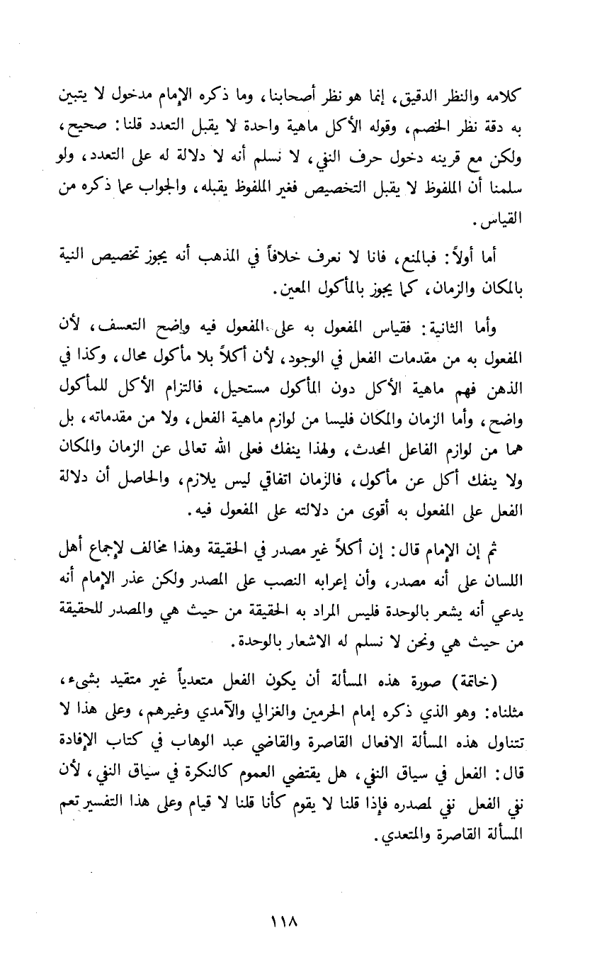 خاتمة: صورة هذه المسألة ان يكون الفعل متعديا غير متقيد بشيء مثلناه وهو الذي ذكره إمام الحرمين والغزالي والآمدي وغيرهم وعلى هذا لا تتناول هذه المسألة الأفعال القاصرة والقاضي عبد الوهاب في كتاب الإفادة قال الفعل في سياق النفي هل يقتضي العموم كالنكرة في سياق النفي لأن نفي الفعل لمصدره فإذا قلنا لا يقوم كأنا قلنا لا قيام وعلى هذا التفسير تعم المسألة القاصرة والمتعدي.